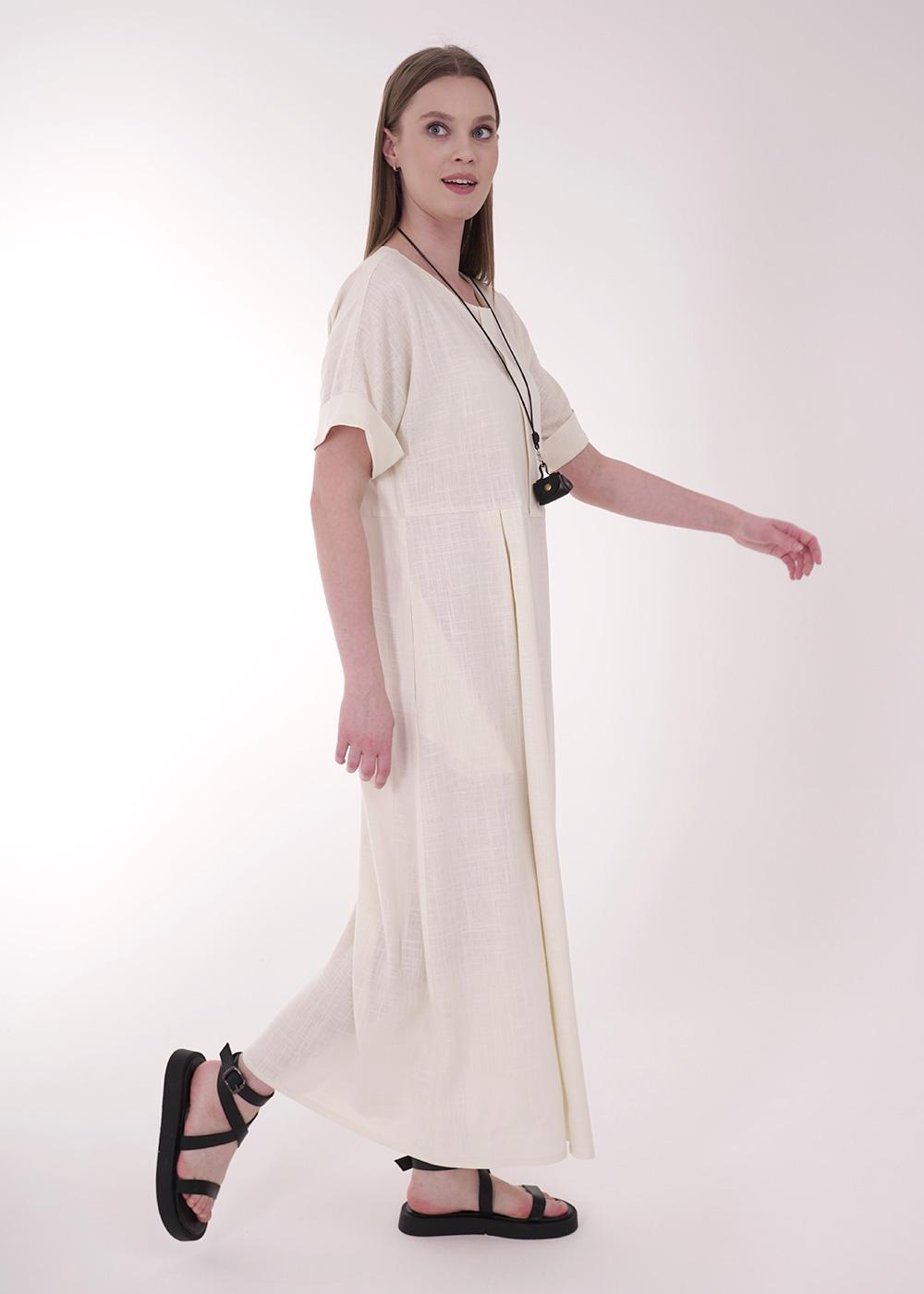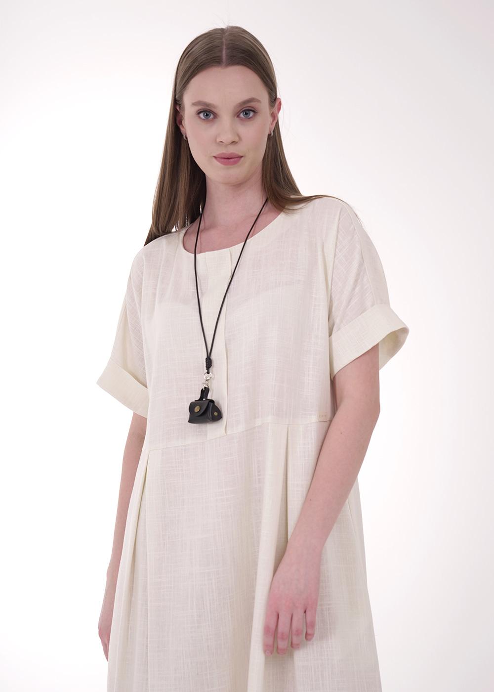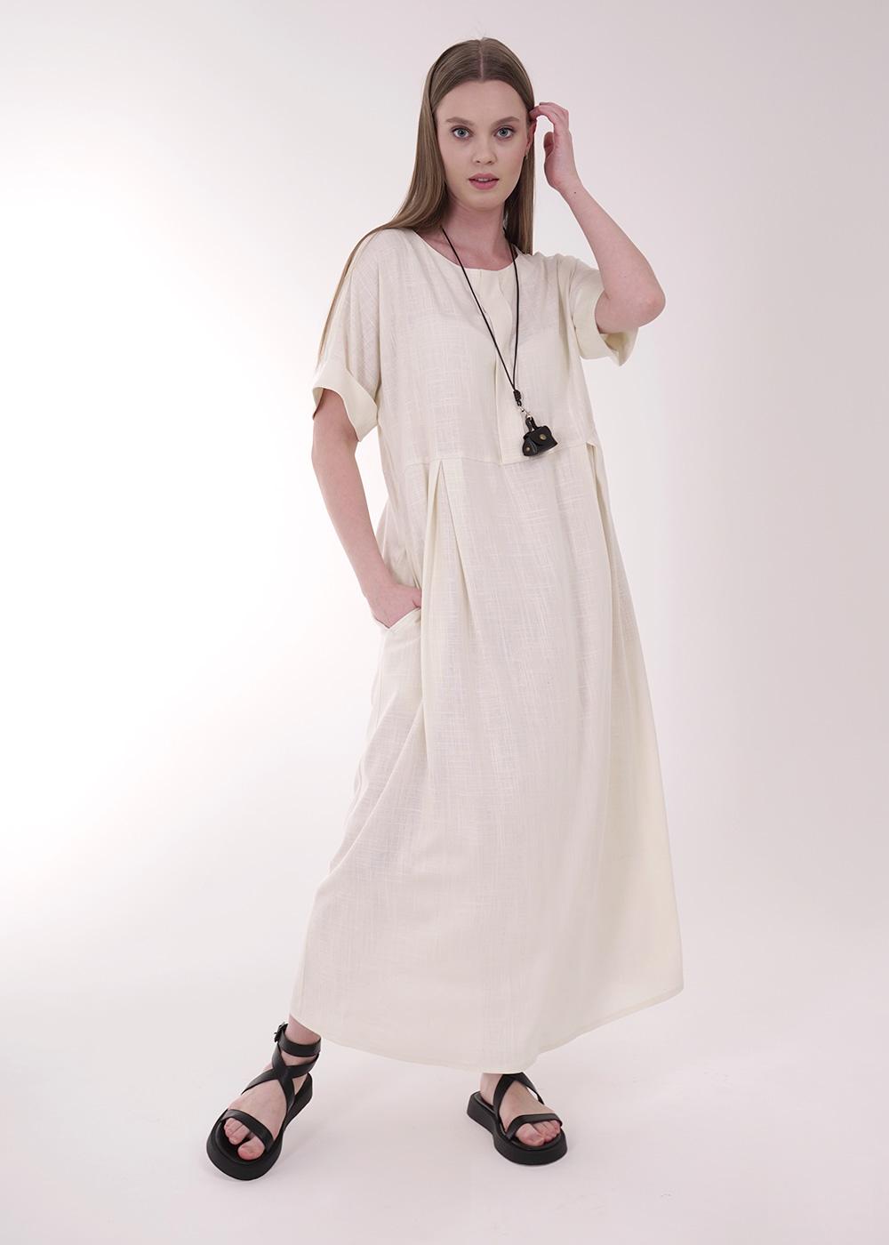 Платье из текстильного полотна лен с вискозой, длиной миди. Отрезное по талии. Горловина с внутренней обтачкой.По переду бантовая складка,нашивка.Короткий цельнокроеный рукав, по низу манжет с отворотом. Сзади средний шов с молнией.Боковые карманы в шве.