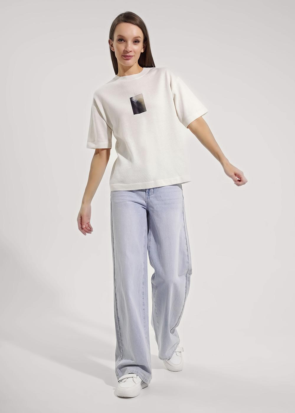 Вязаный джемпер умеренного объема из хлопковой пряжи с добавлением акрила. Короткий рукав со спущенной линией плеча. Длина рукава до локтя. Округлая горловина с бейкой. На детали переда нашивка.