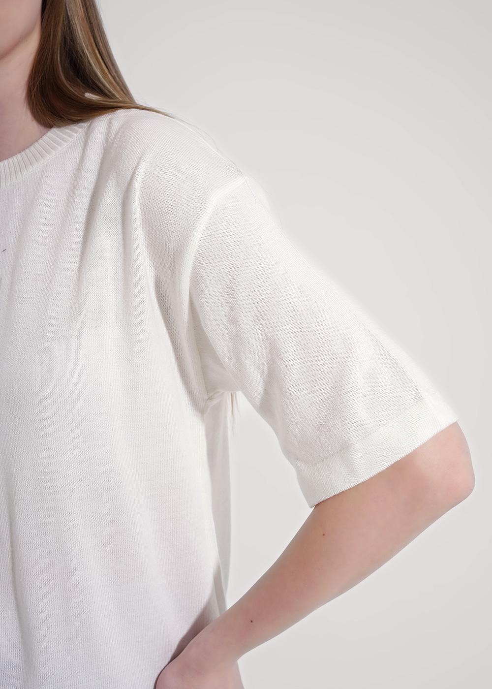 Вязаный джемпер умеренного объема из хлопковой пряжи с добавлением акрила. Короткий рукав со спущенной линией плеча. Длина рукава до локтя. Округлая горловина с бейкой. На детали переда нашивка.