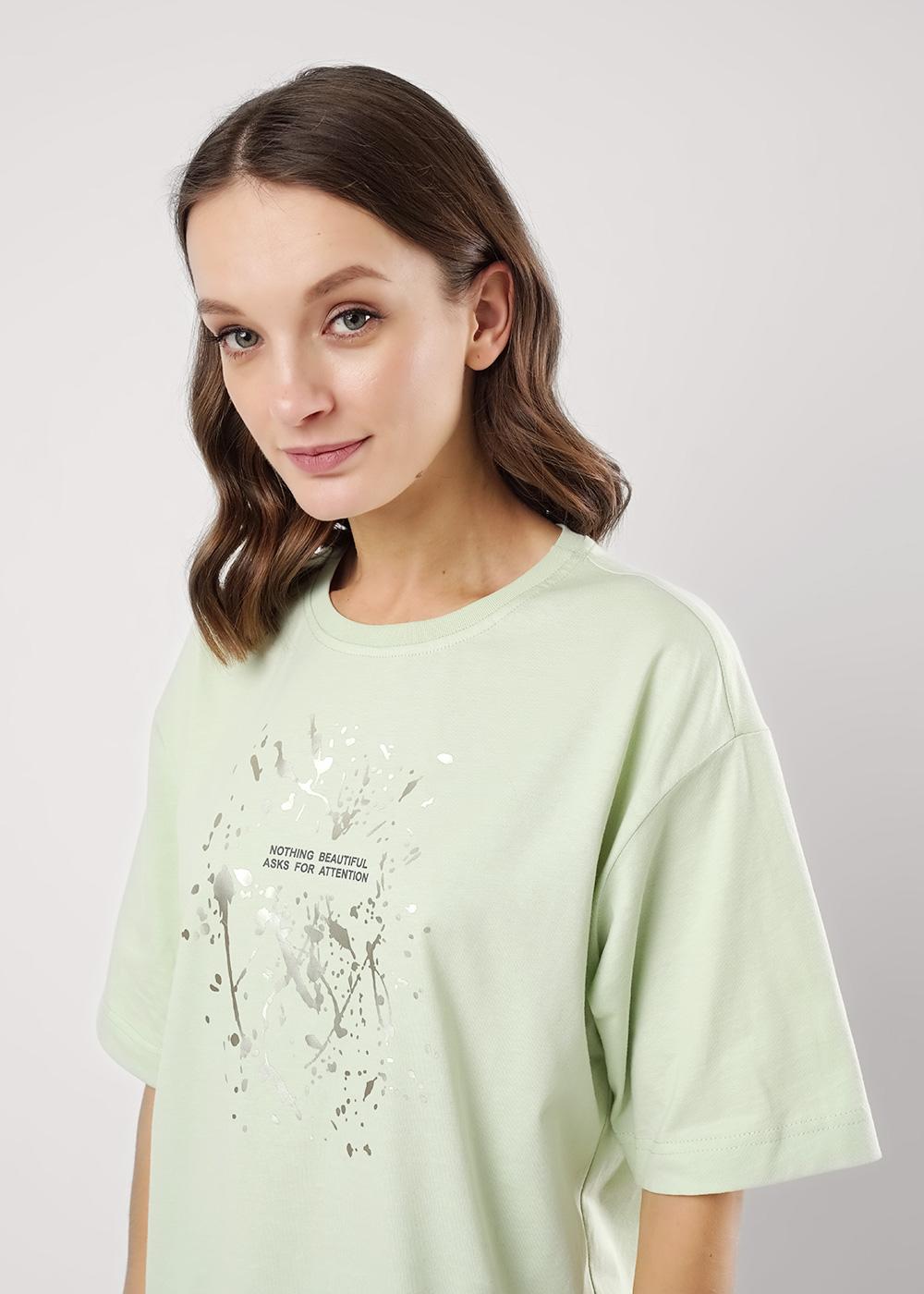 Футболка оверсайз свободного кроя из хлопкового трикотажного полотна. Слегка спущенный короткий рукав. Округлая горловина с обтачкой из рибаны. По спинке средний шов. Спереди принт с фольгой.