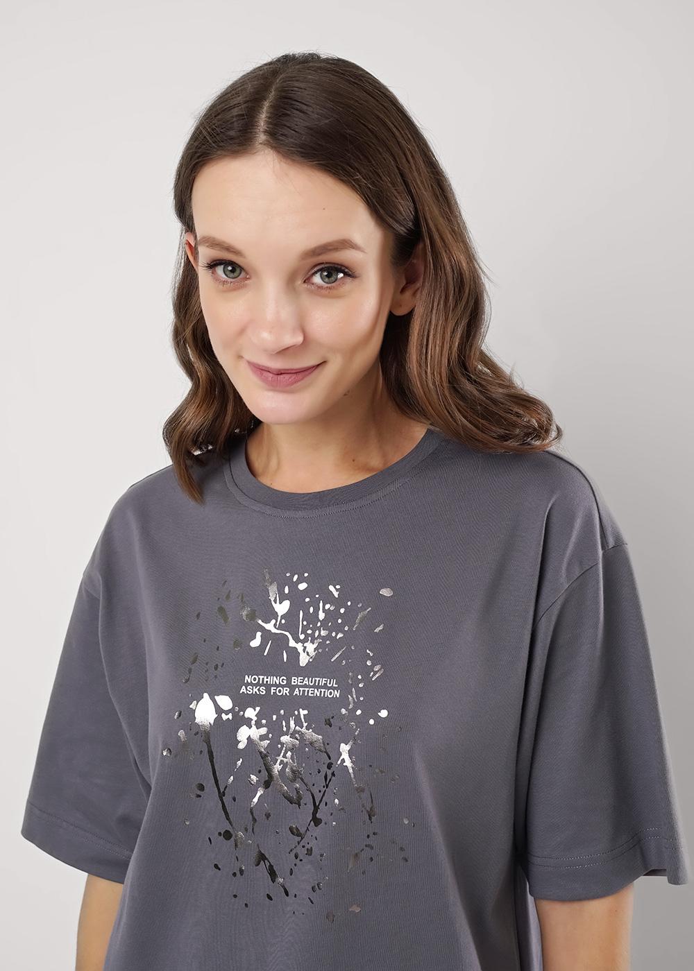 Футболка оверсайз свободного кроя из хлопкового трикотажного полотна. Слегка спущенный короткий рукав. Округлая горловина с обтачкой из рибаны. По спинке средний шов. Спереди принт с фольгой.