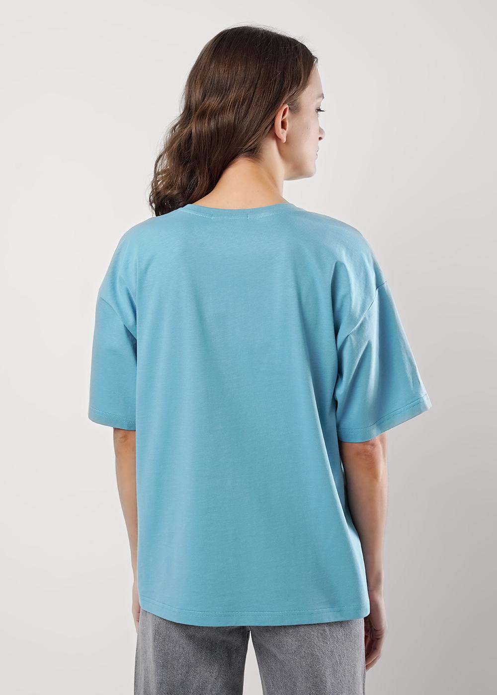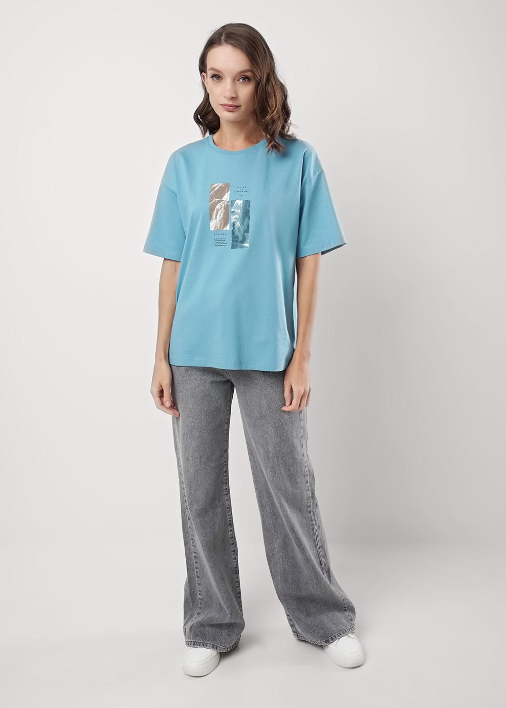Футболка из хлопкового трикотажного полотна. Короткий спущенный рукав. Округлый вырез горловины с обтачкой из рибаны. По переду принт.