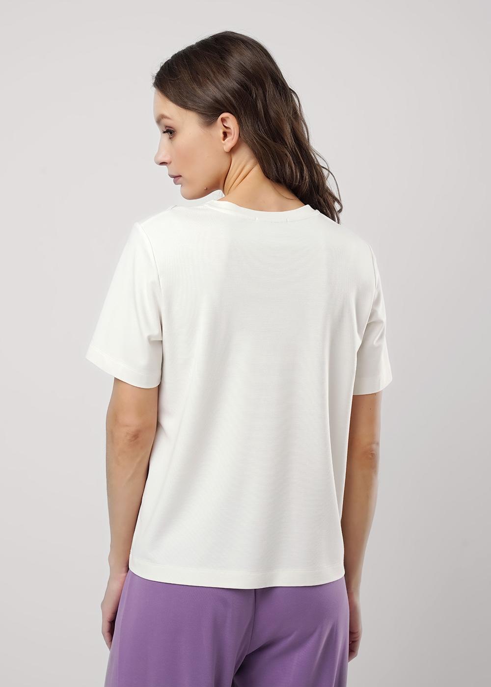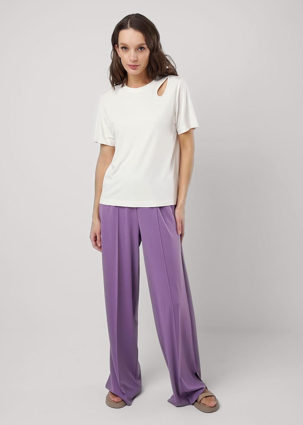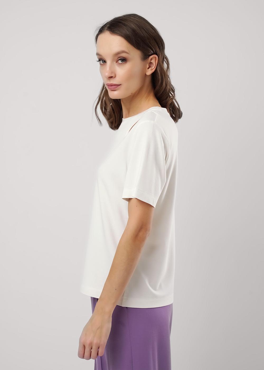 Футболка прямого силуэта из трикотажного полотна интерлок. Короткий втачной рукав. Округлая горловина с обтачкой. По левой линии плеча фигурный вырез с окантовкой.