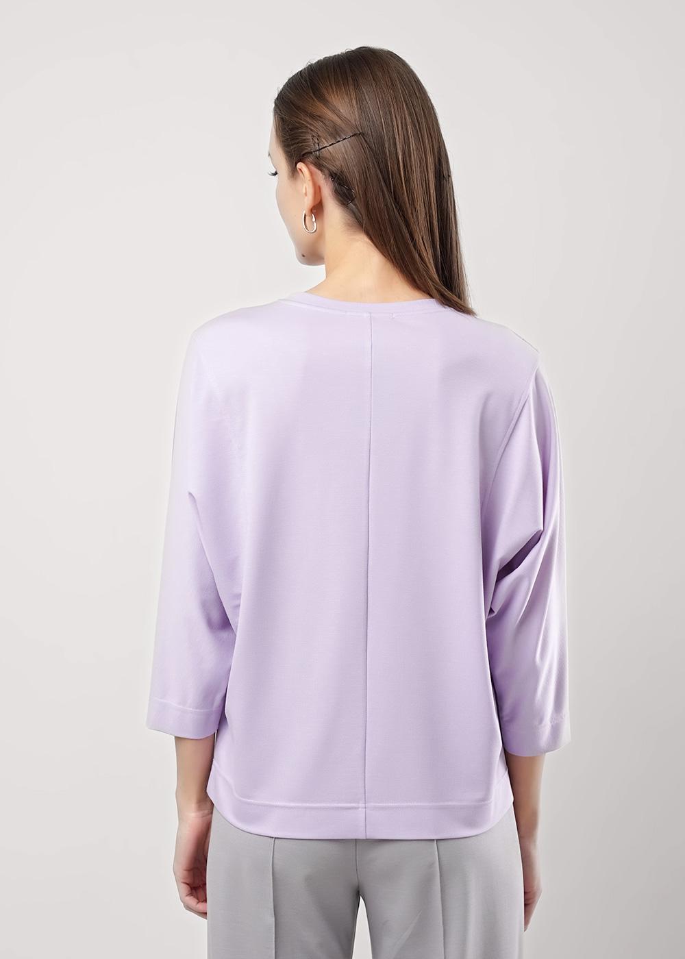 Джемпер свободного кроя из вискозного трикотажного полотна. Округлая горловина с обтачкой. Цельнокроеный рукав длиной 3/4. По переду и спинке отстроченные резы. По спинке средний шов. По бокам небольшие разрезы. Спереди принт фольга.