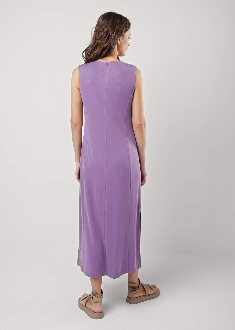 Платье из трикотажного полотна пике, без рукавов А-образного силуэта. Округлая горловина. По плечу хлястики.Спереди рельефы,боковые карманы в швах.На детали спинки средний шов с молнией, рельефы. По горловине и пройме внутренняя обтачка. Боковые разрезы.