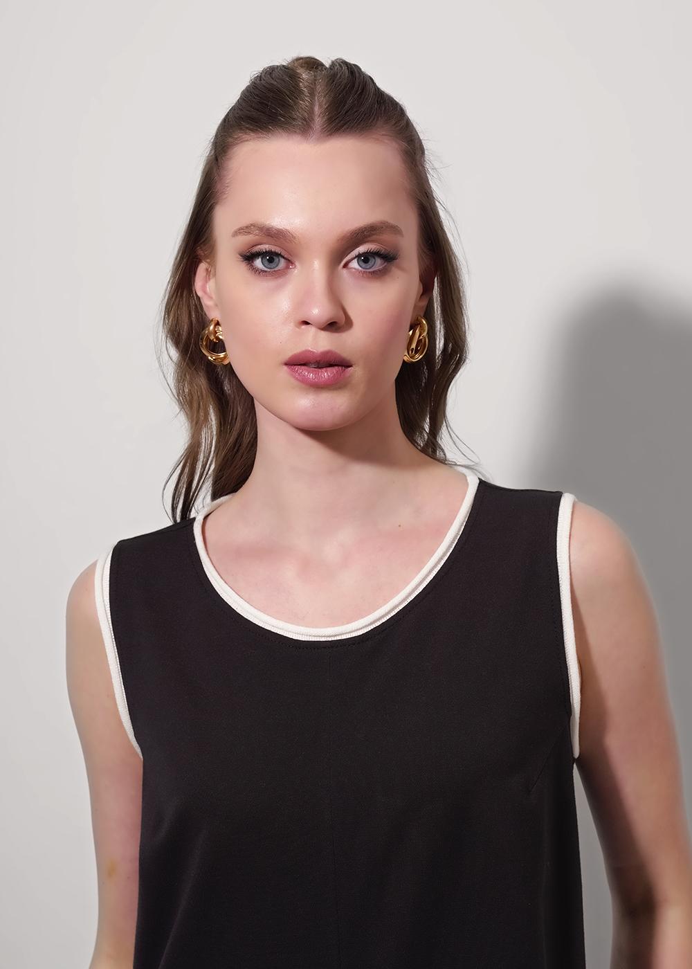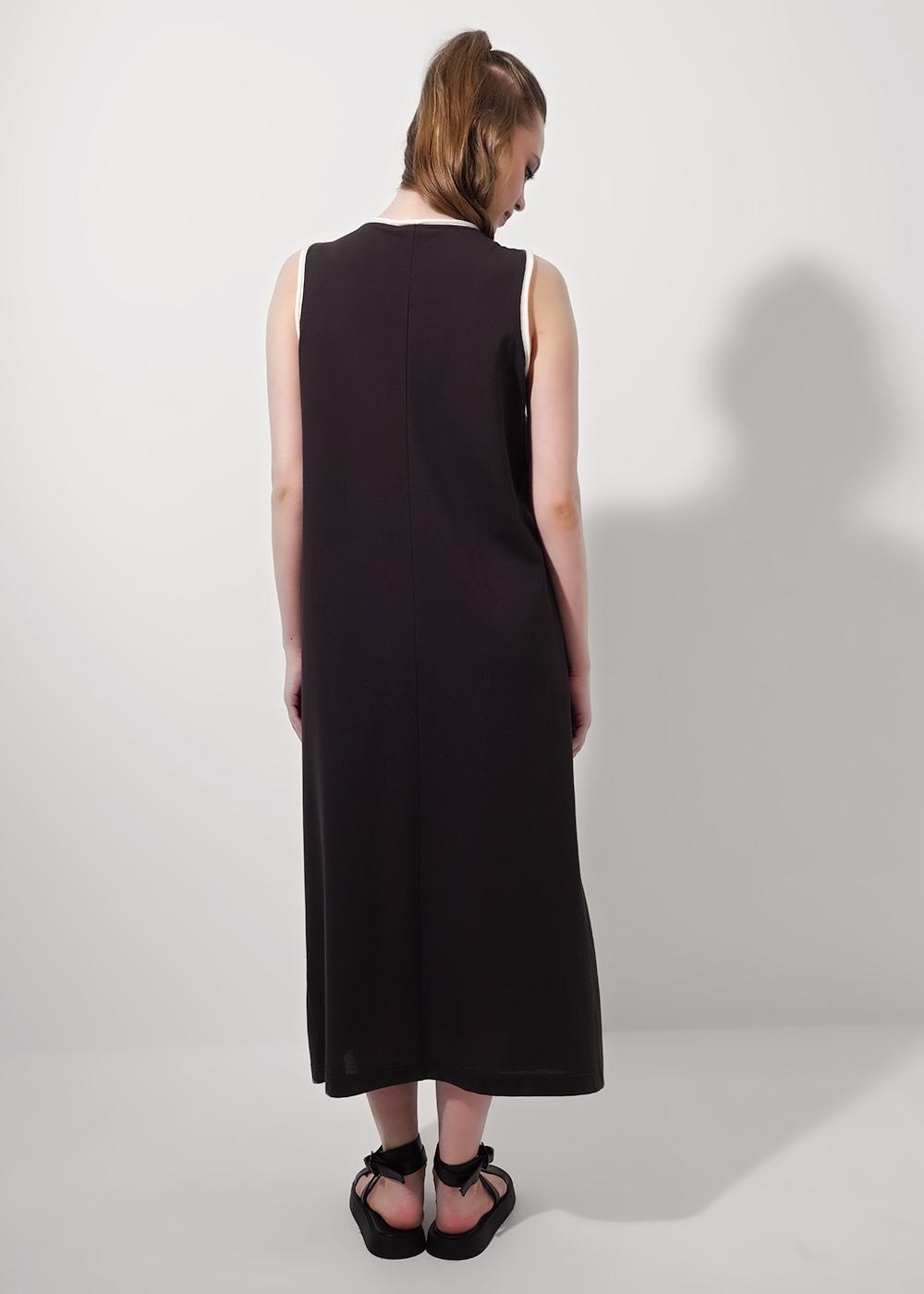 Платье из трикотажного полотна пике, А-образного силуэта длиной миди без рукавов. Спереди средний шов,переходящий в складку. Округлая горловина, по горловине и пройме контрастные вязаные обтачки. По спинке средний шов.