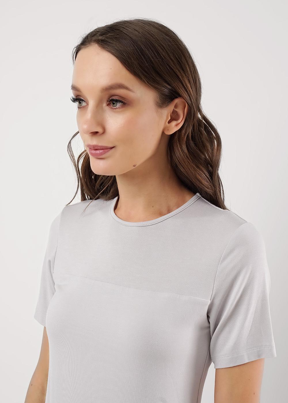 Футболка из трикотажного полотна с добавлением модала. Округлая горловина с окантовкой. Короткий втачной рукав. Спереди кокетка, нижняя часть переда двойная.