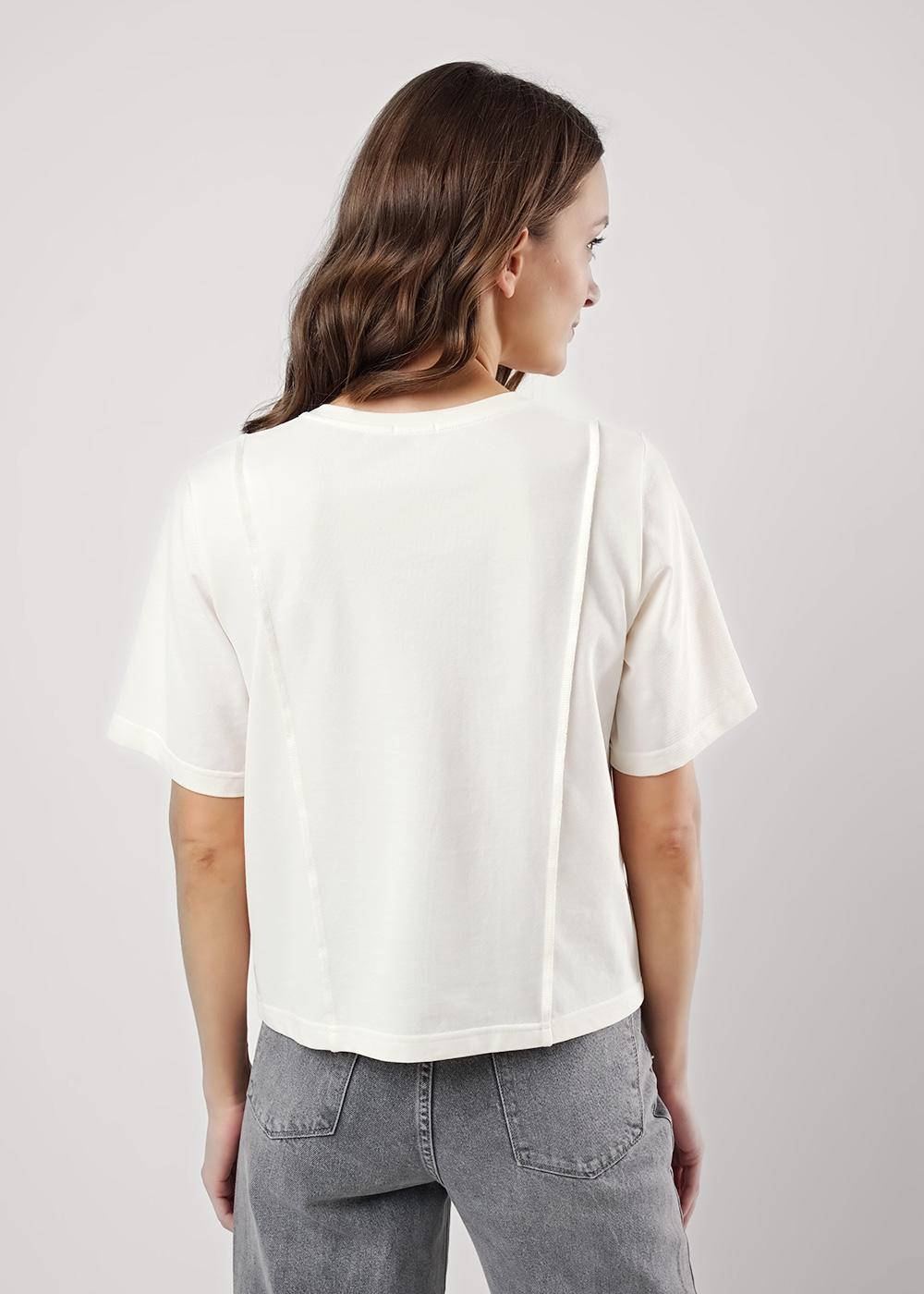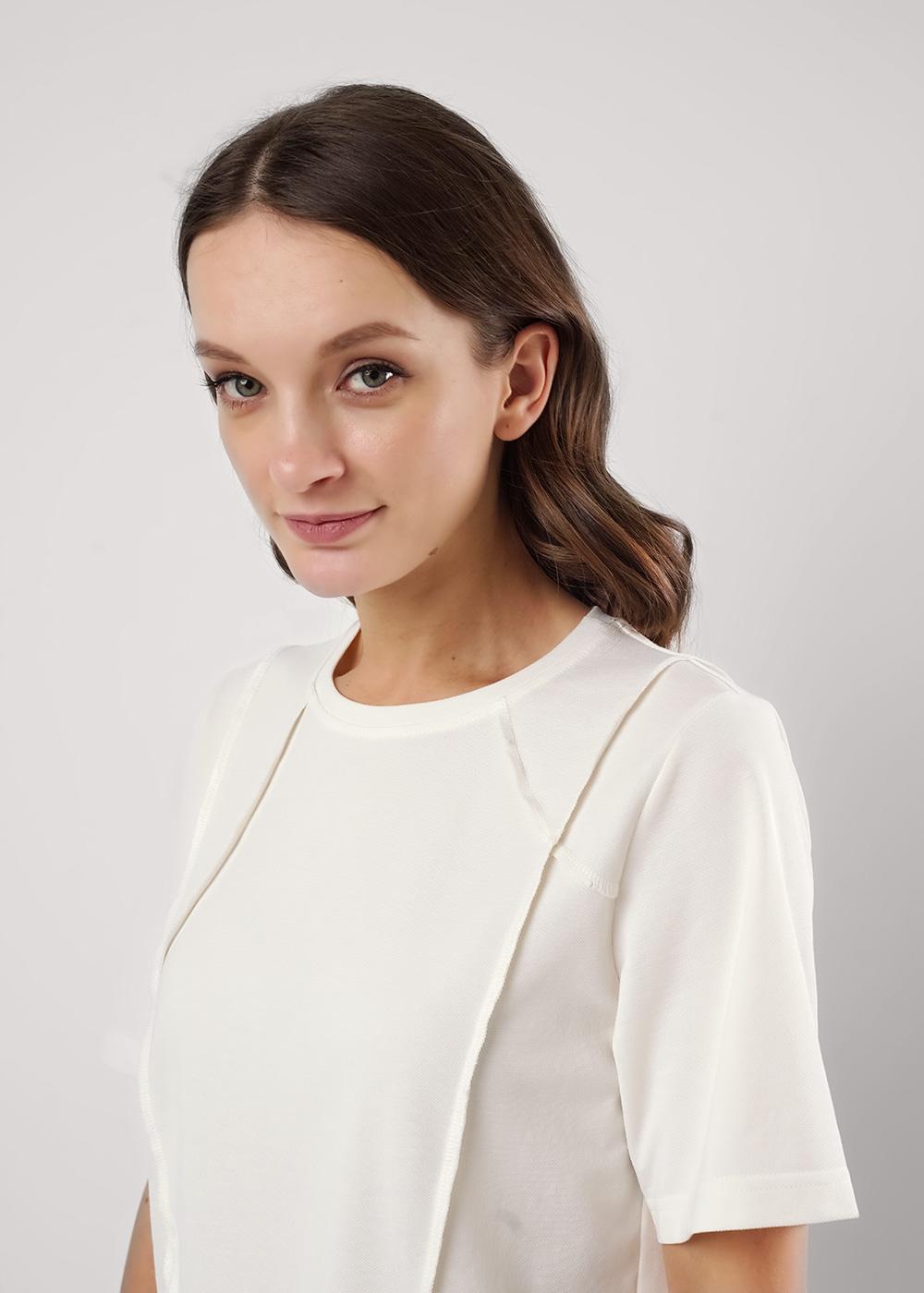 Футболка из трикотажного полотна пике, прямого кроя. Округлая горловина с обтачкой. Короткий втачной рукав. По переду и спинке декоративные резы, швами наружу обработанные на оверлоке.