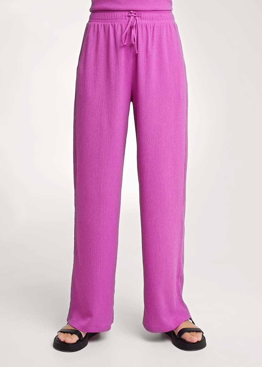 Брюки широкие из трикотажного полотна джерси. По талии притачной пояс на внутренней резинке со шнуром из основного полотна. Боковые карманы с отрезным бочком.