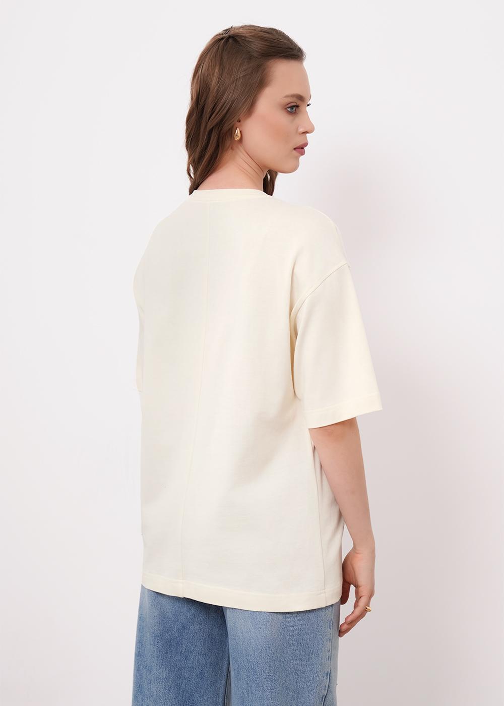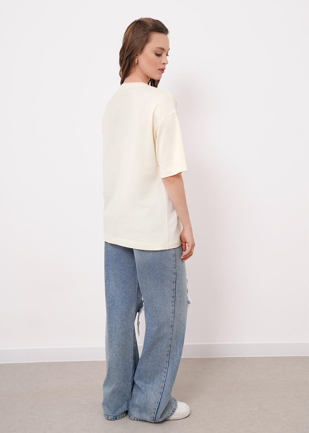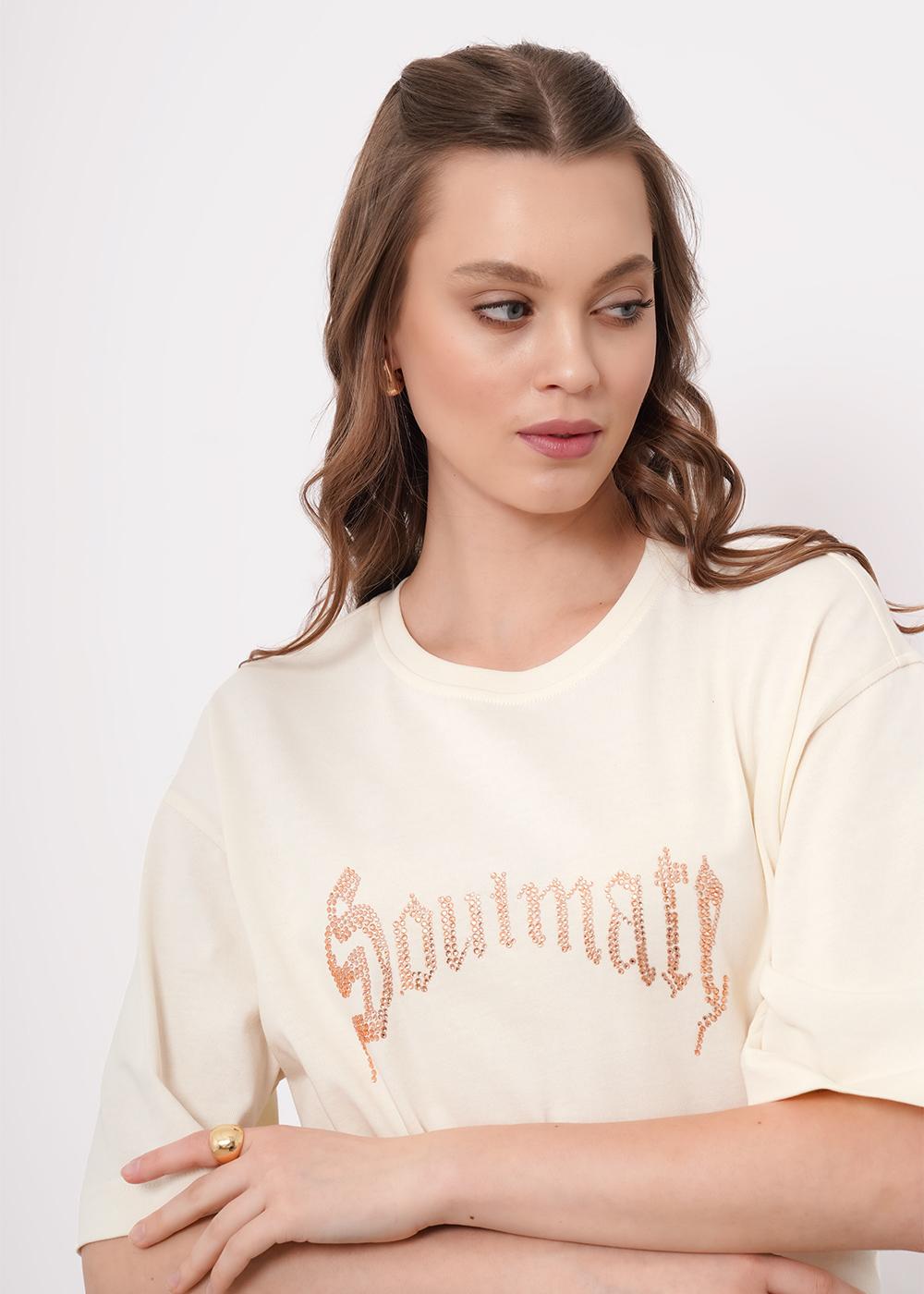 Футболка оверсайз из хлопкового трикотажного полотна. Короткий спущенный рукав. Округлая горловина с обтачкой из рибаны. По спинке средний шов. По переду термостразы.