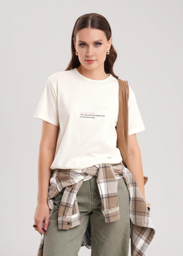 Футболка прямого кроя из хлопкового трикотажного полотна. Короткий втачной рукав. Округлая горловина с обтачкой. Спереди принт с вышивкой.