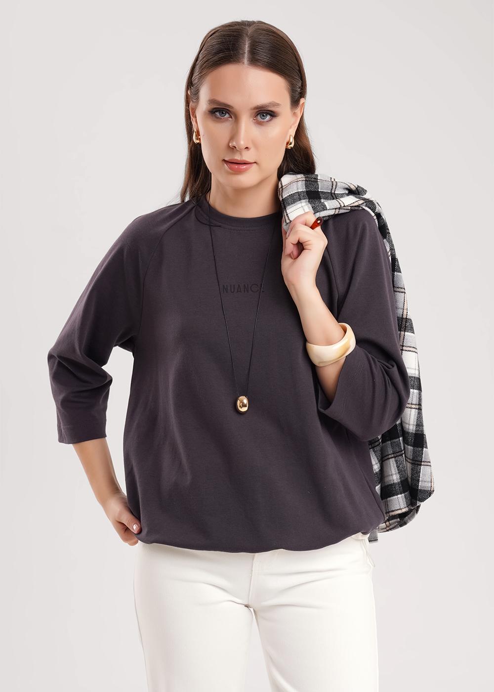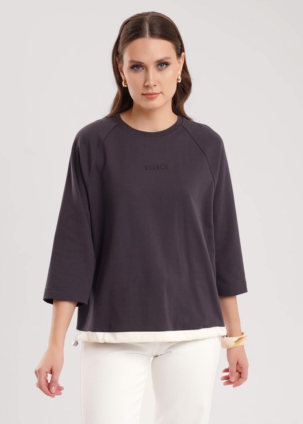 Джемпер свободного кроя из эластичного хлопкового полотна. Рукав реглан длиной 7/8. Округлая горловина с обтачкой. По низу изделия притачная контрастная кулиса с внутренним шляпным шнуром и стопором. Спереди принт.