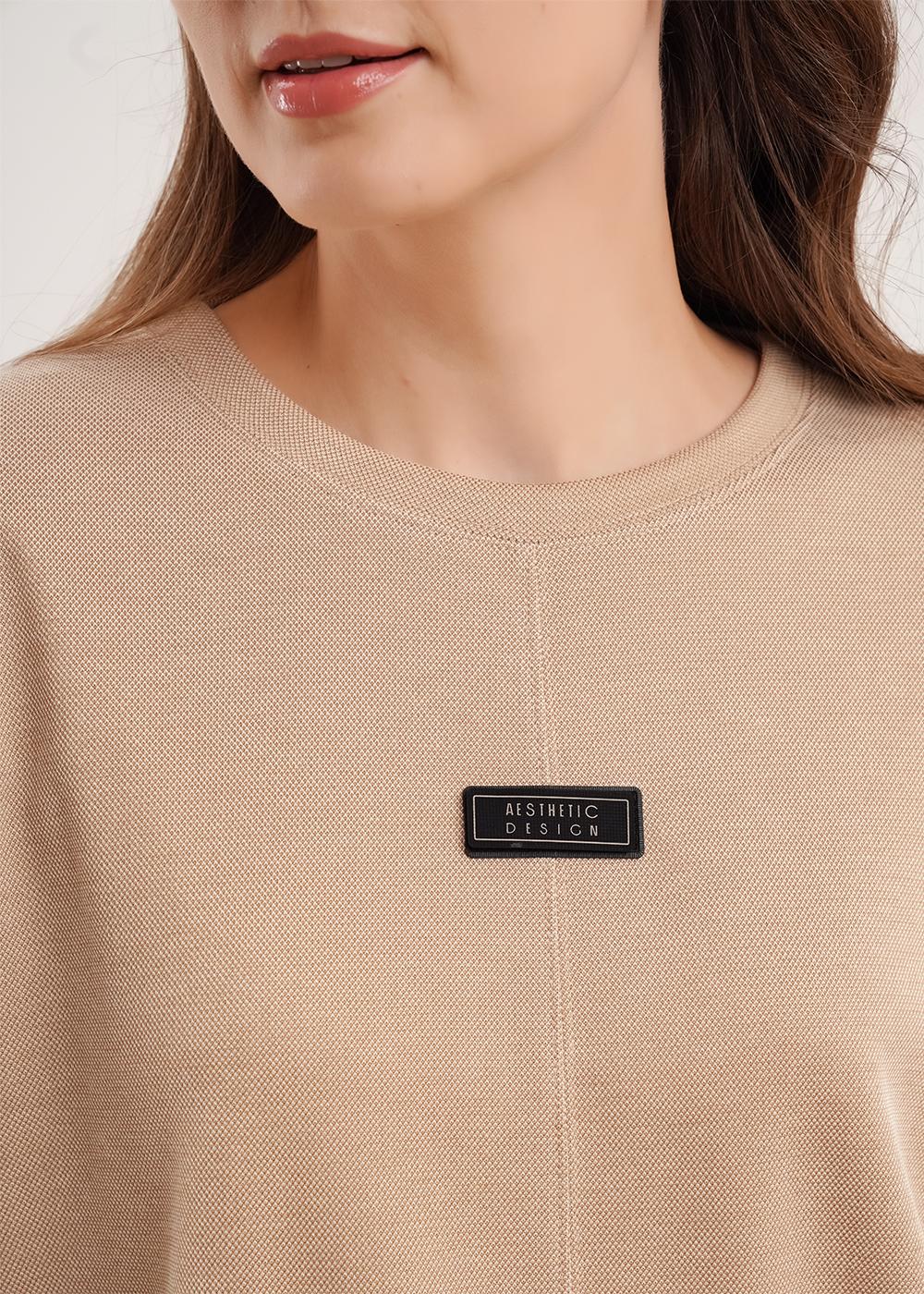 Джемпер объёмный из трикотажного полотна пике жаккард. Округлая горловина с обтачкой. По переду средний шов, нашивка. Длинный спущенный рукав, по рукаву резы. Средний шов, пройма и резы отстрочены.