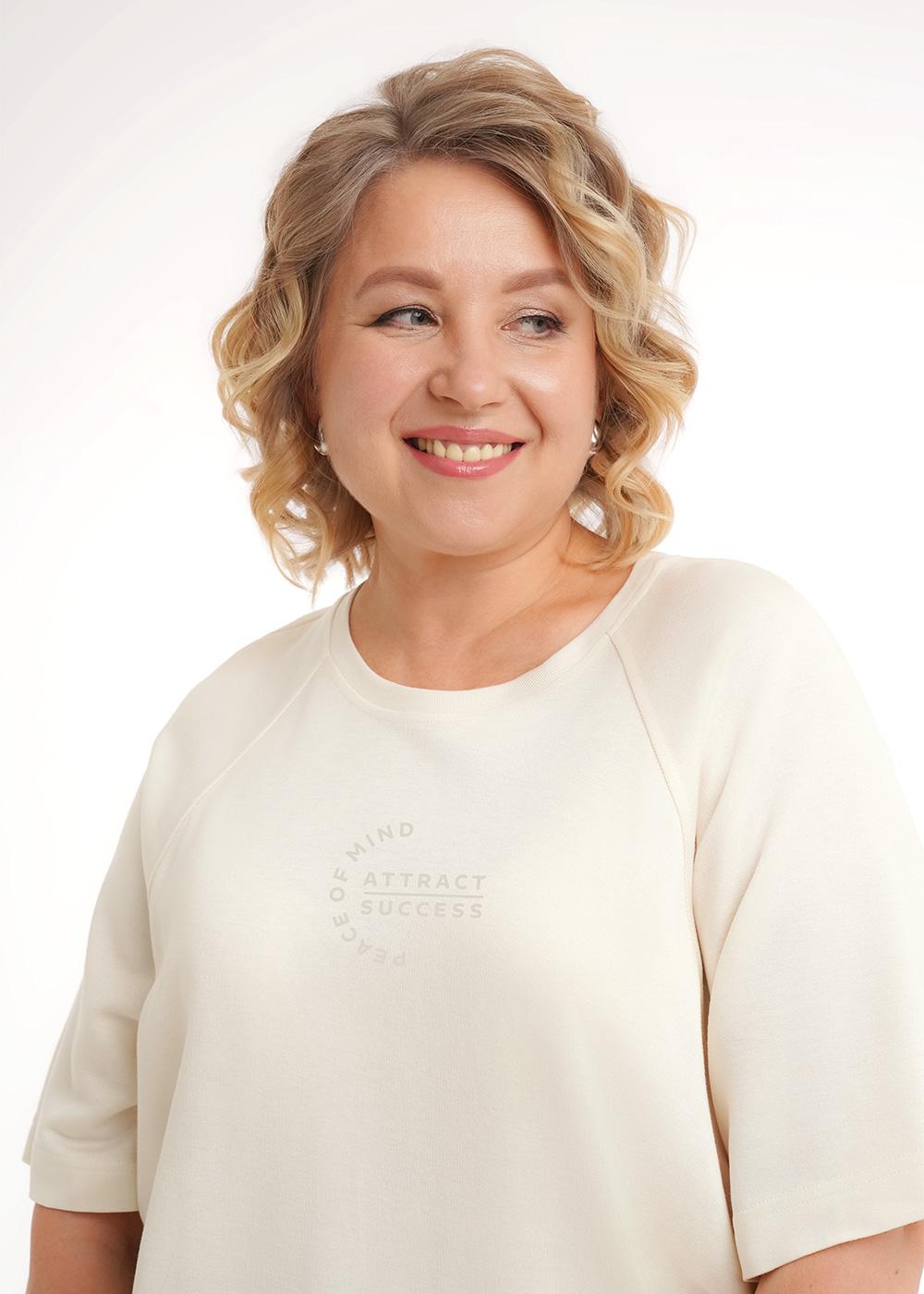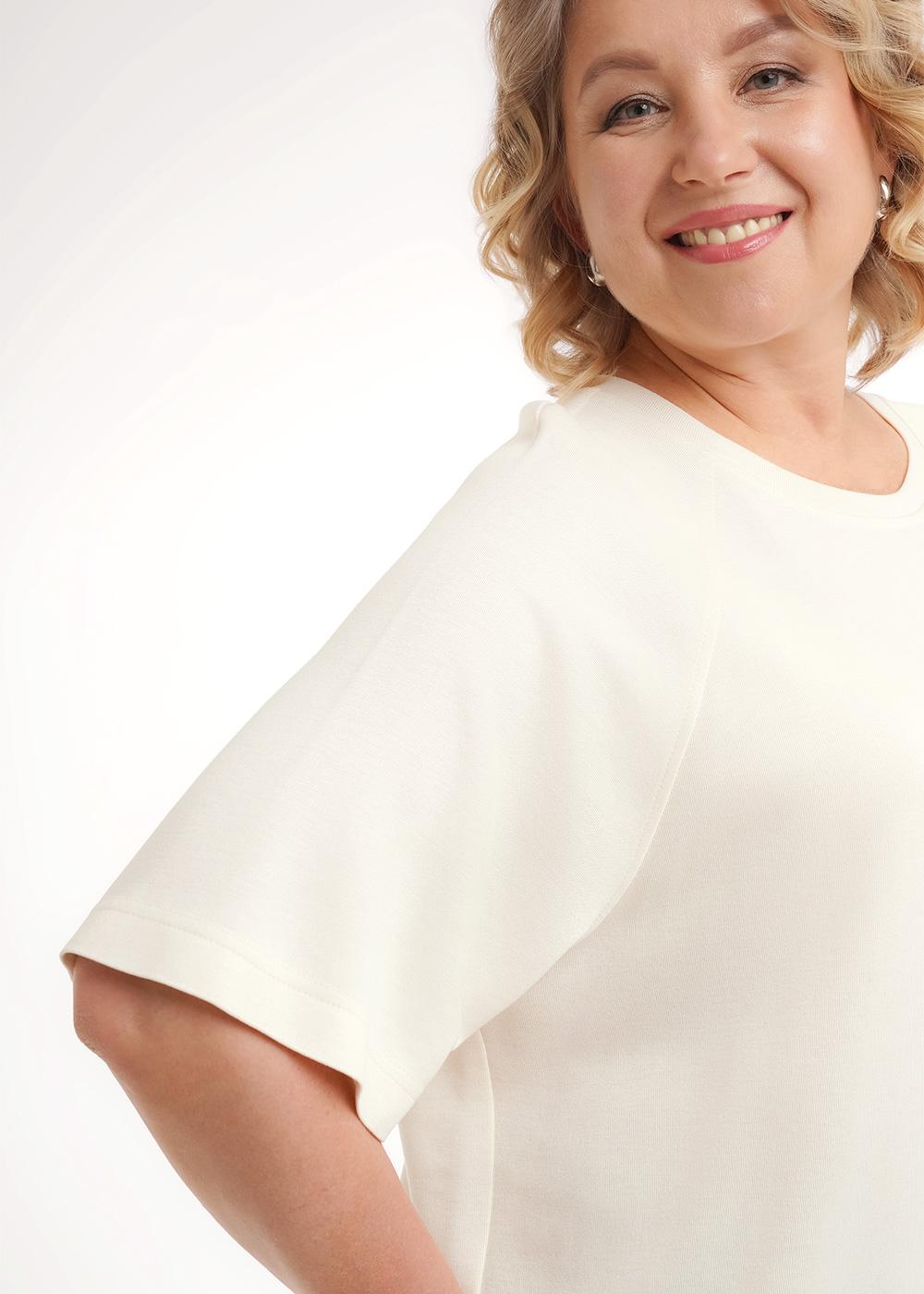 Джемпер свободного кроя из трикотажного полотна джерси. Короткий рукав реглан. Округлая горловина с обтачкой. По низу изделия кулиса с тесьмой. Спереди принт прорезинка.