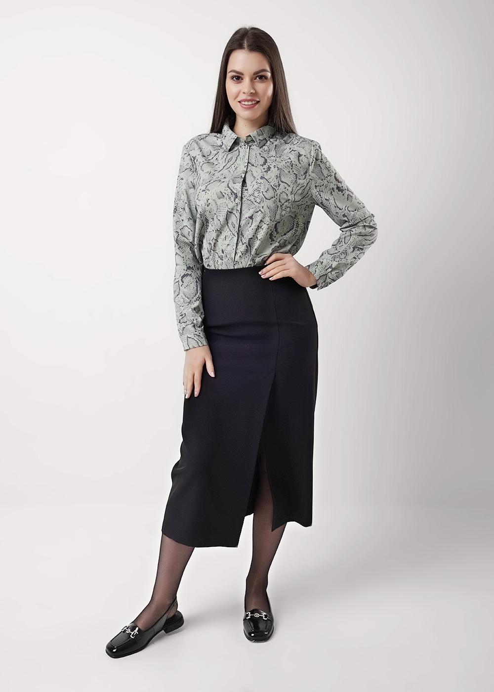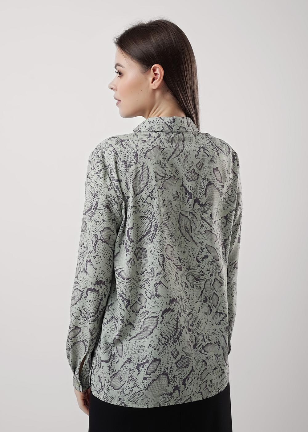 Блузка среднего объема из текстильного полотна штапель, отложной воротник со стойкой. Цельнокроеная планка с застежкой на пуговицы. Втачной длинный рукав с притачным манжетом и застежкой на пуговицы. Низ прямой, по бокам разрезы.