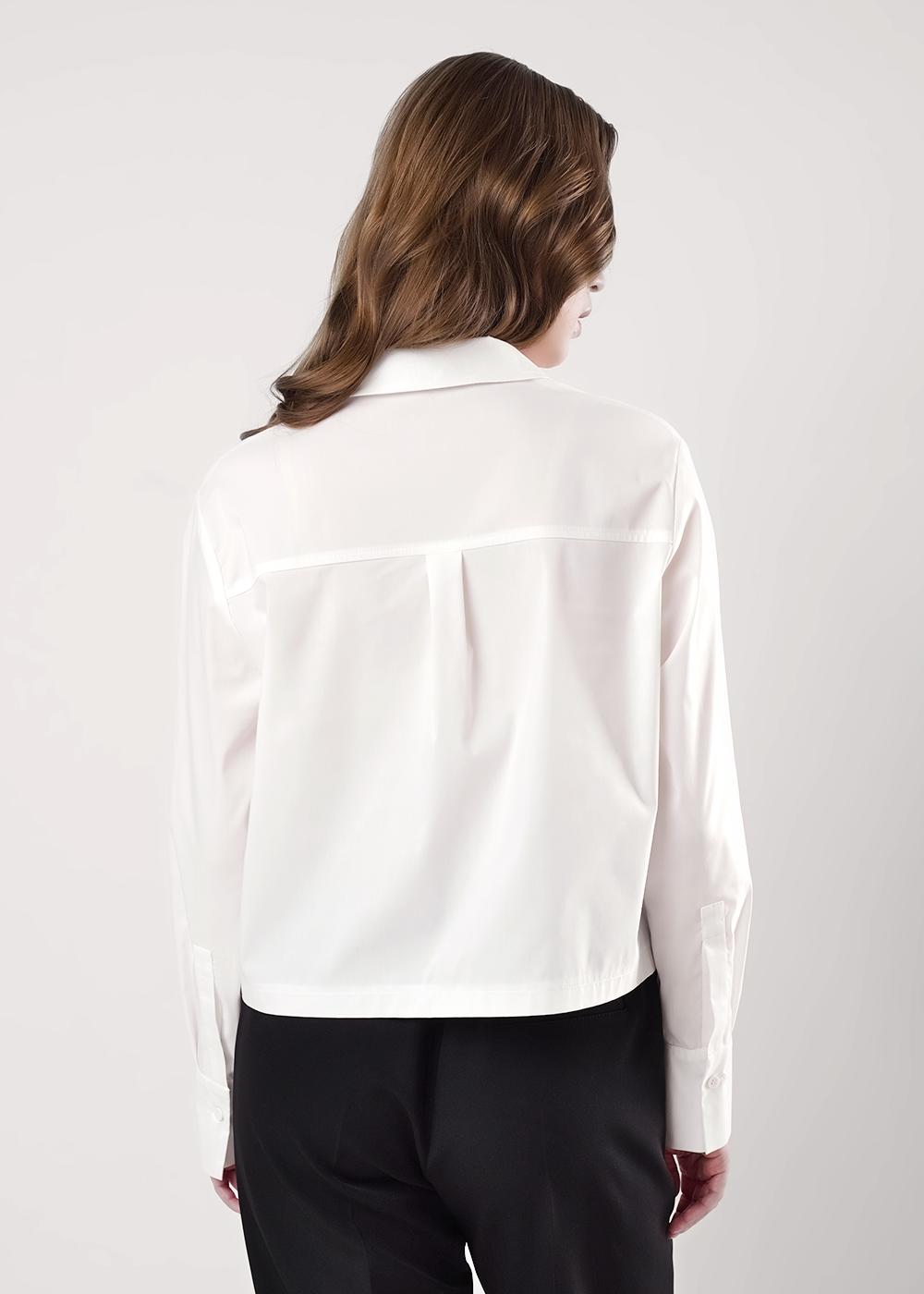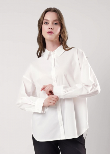 Блузка прямого силуэта из текстильного полотна поплин, с отложным воротником на стойке. Спереди цельновыкроенная планка с застежкой на пуговицы. Длиный втачной рукав, внизу с притачной манжетой и застежкой на пуговицу. По спинке кокетка со складками.