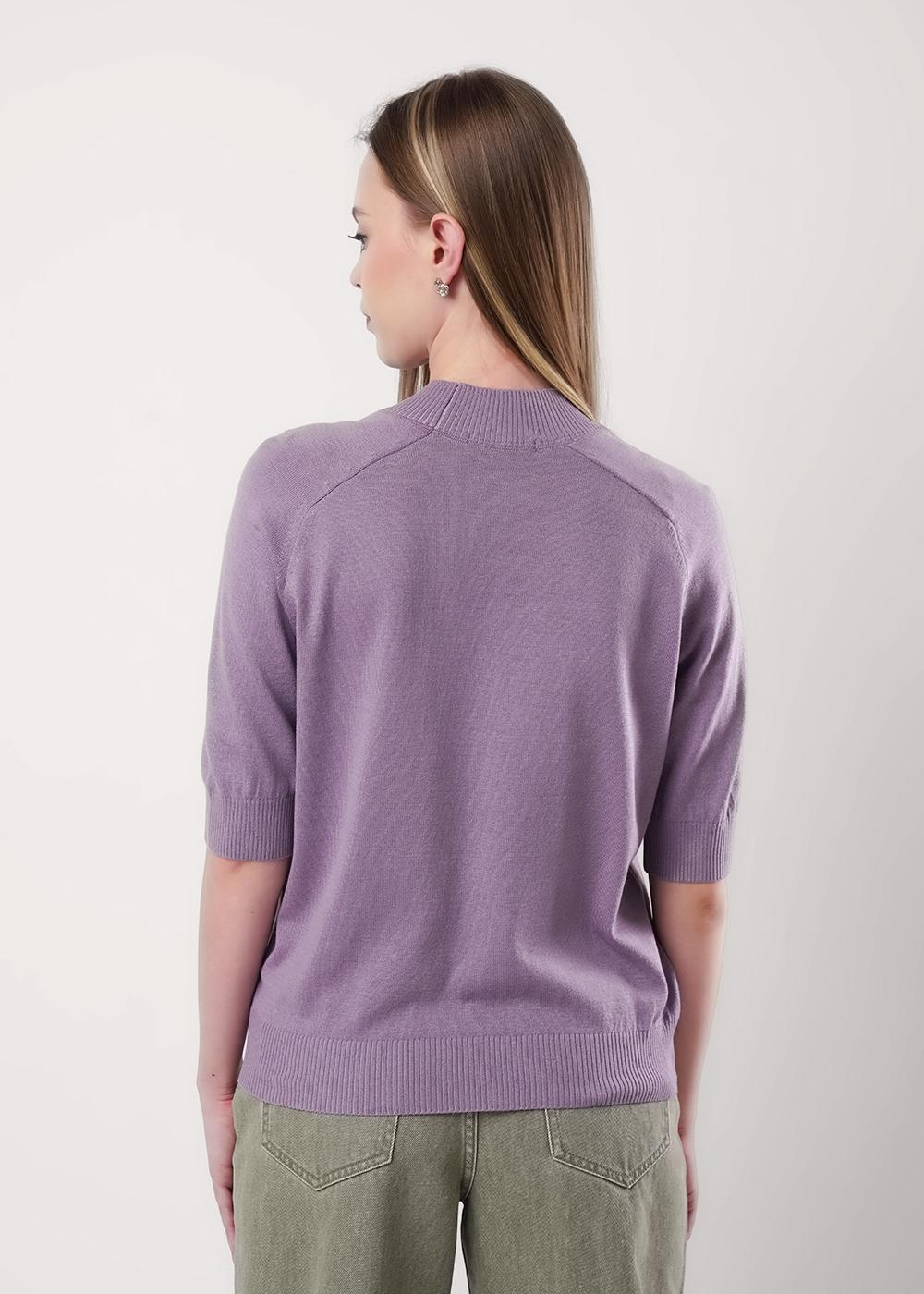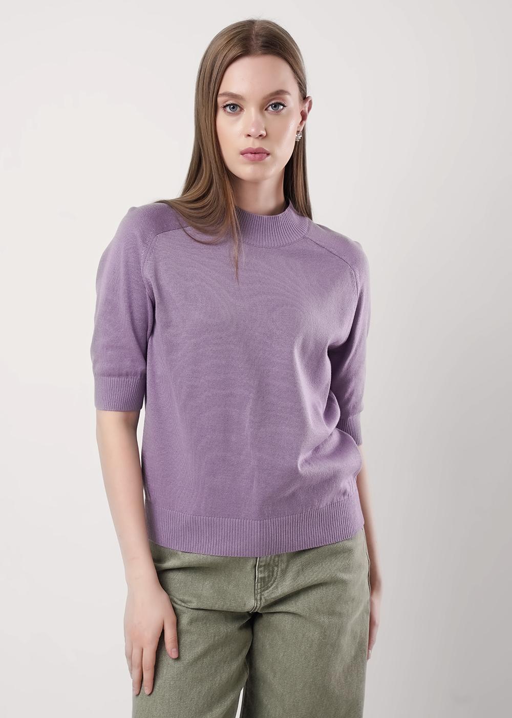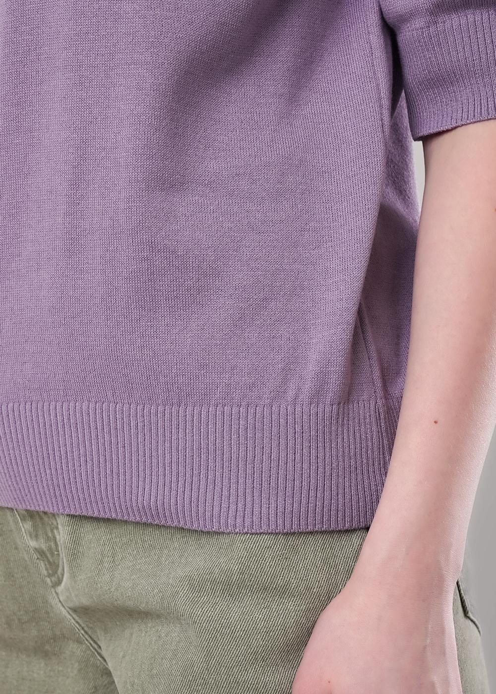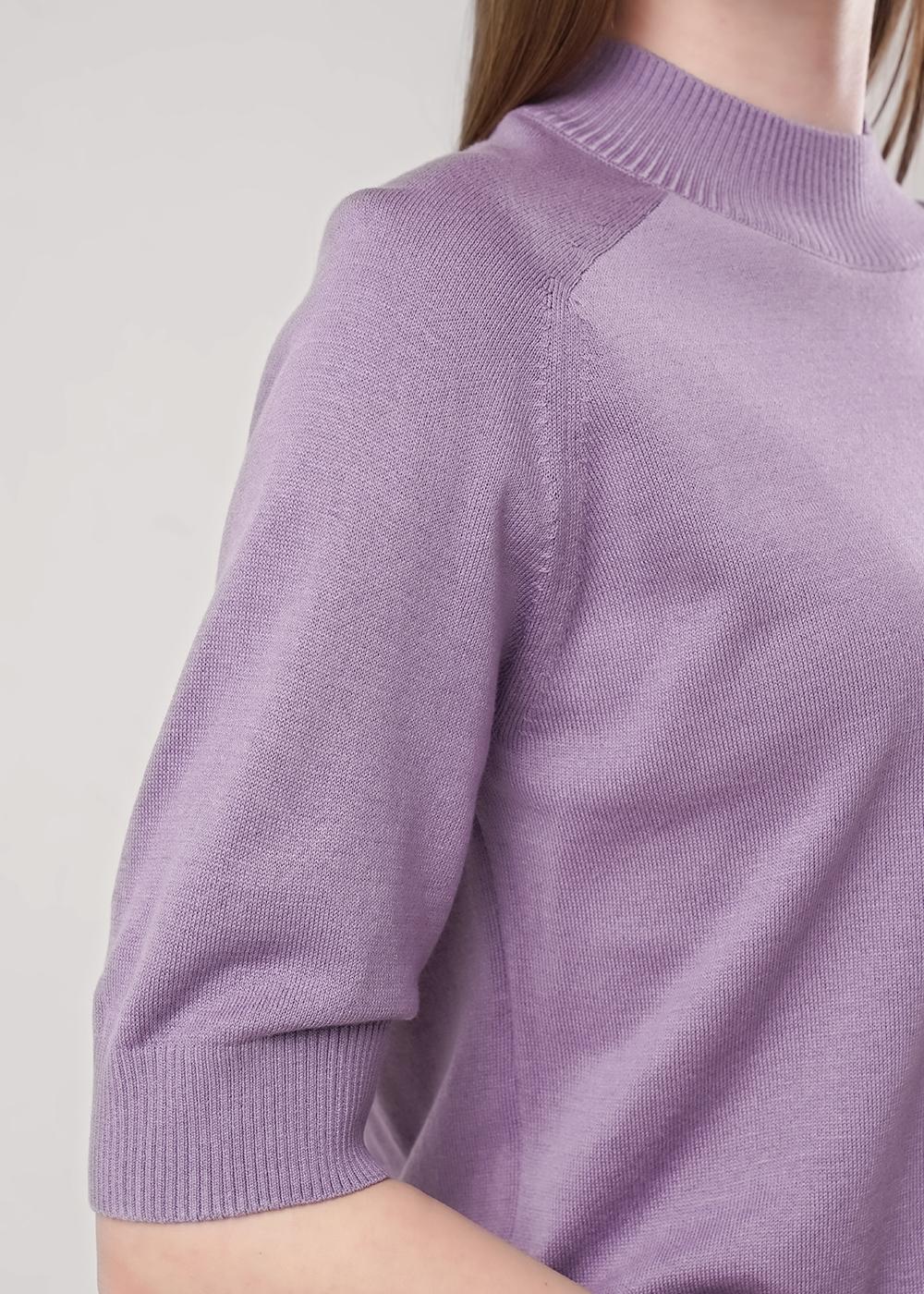 Вязаный джемпер прямого силуэта акриловой пряжи с добавлением хлопка, переплетение гладь. Короткий рукав реглан. Округлая горловина с полустойкой. По низу изделия и рукавов манжеты.