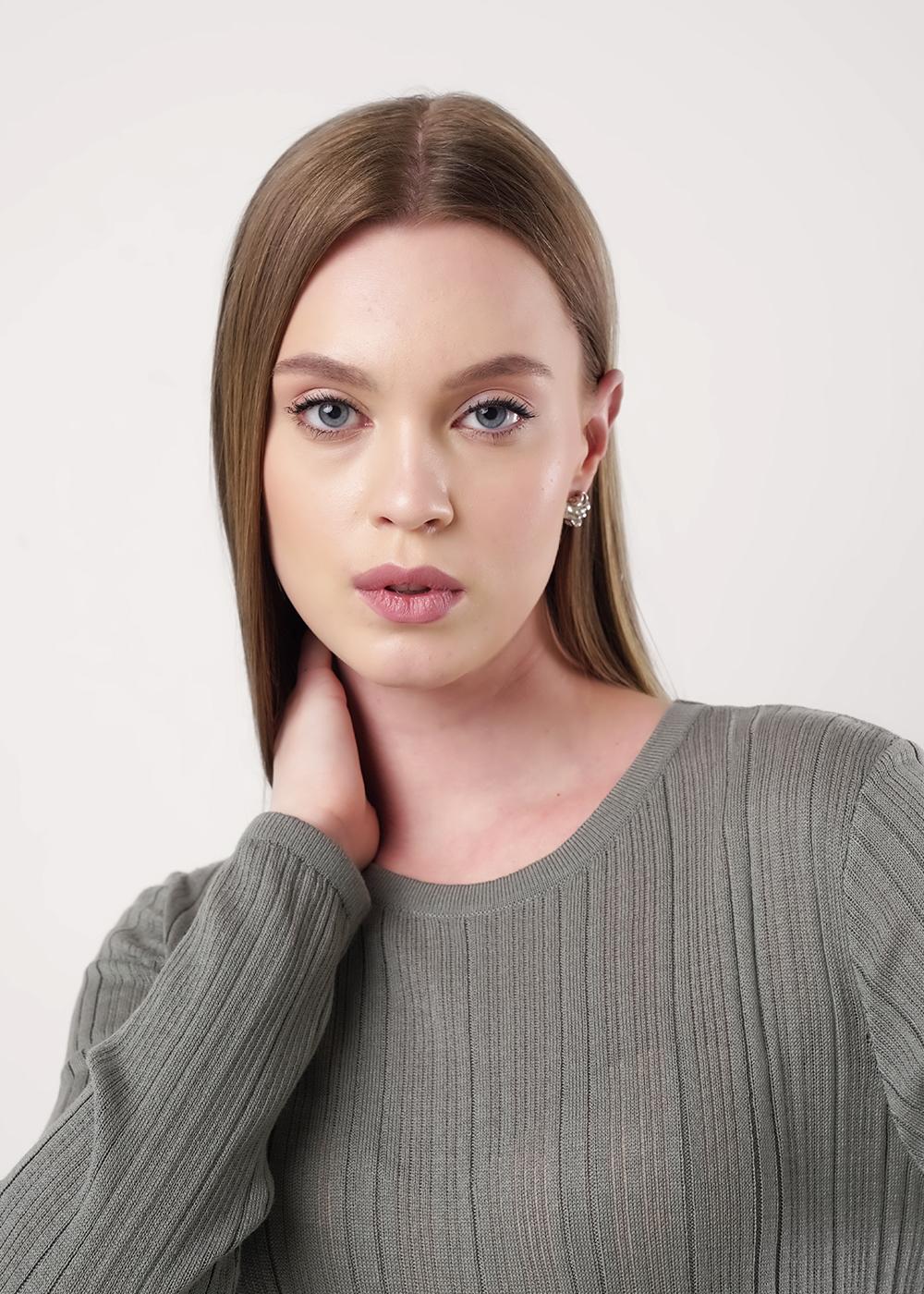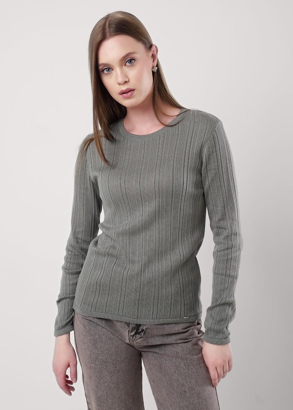 Вязаный джемпер прямого силуэта из акриловой пряжи с добавлением хлопка, ажурного переплетения на основе ластика. Округлая горловина с бейкой. Длинный втачной рукав. По низу изделия и рукавов узкие манжеты. Спереди нашивка металл.