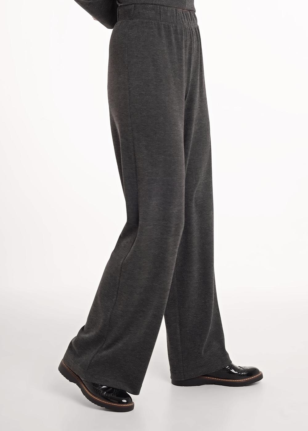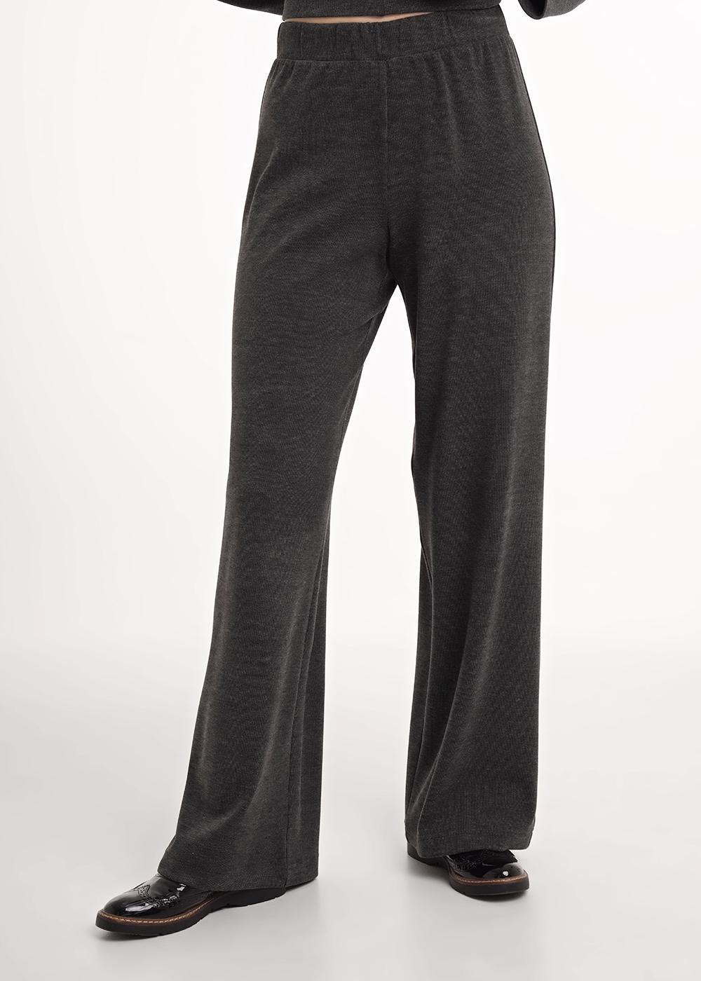 Широкие брюки из трикотажного полотна рибана с вискозой. Модель свободного, прямого кроя. Притачной пояс на внутренней резинке.