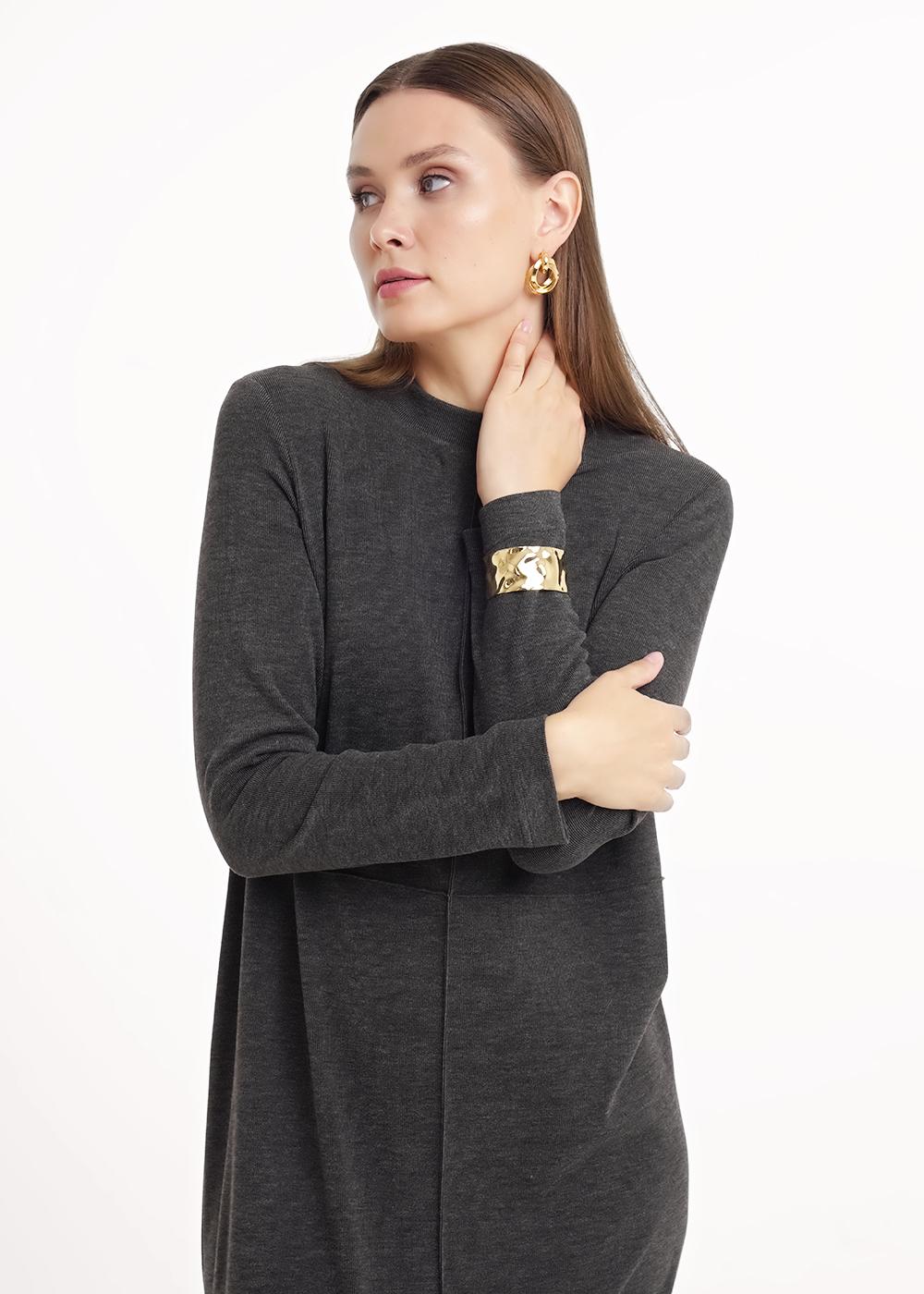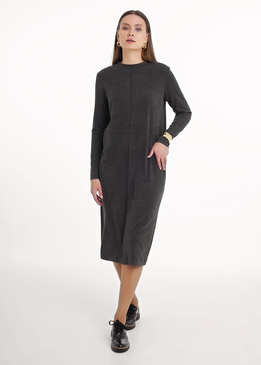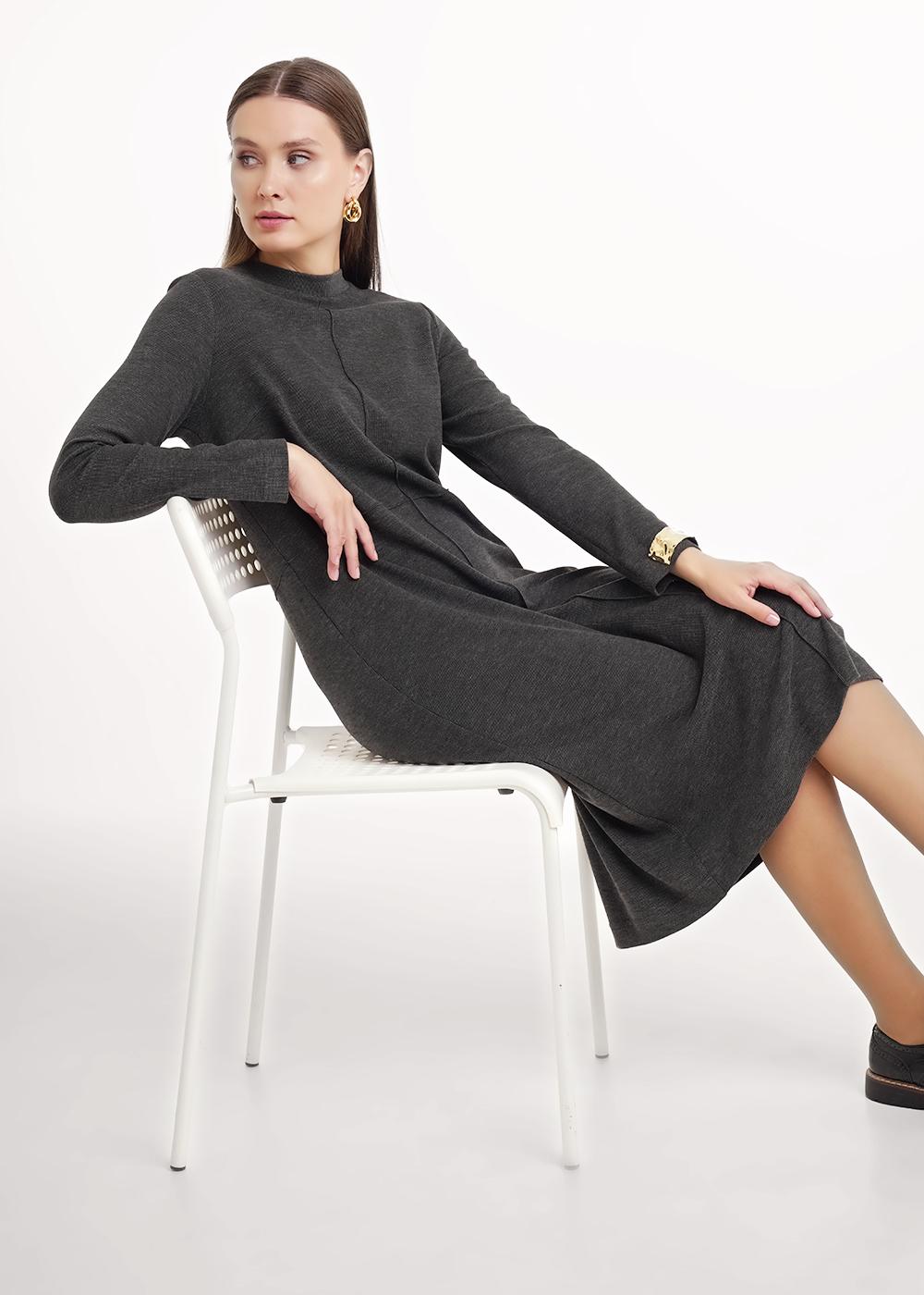 Платье прямого силуэта из трикотажного полотна рибана с вискозой. Длиной ниже колена. Округлая горловина с обтачкой. По переду и спинке вертикальные и горизонтальные защипы. Длинный втачной рукав.