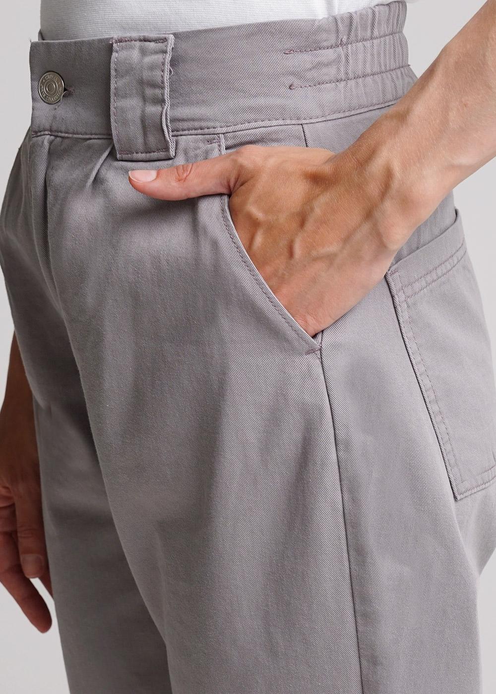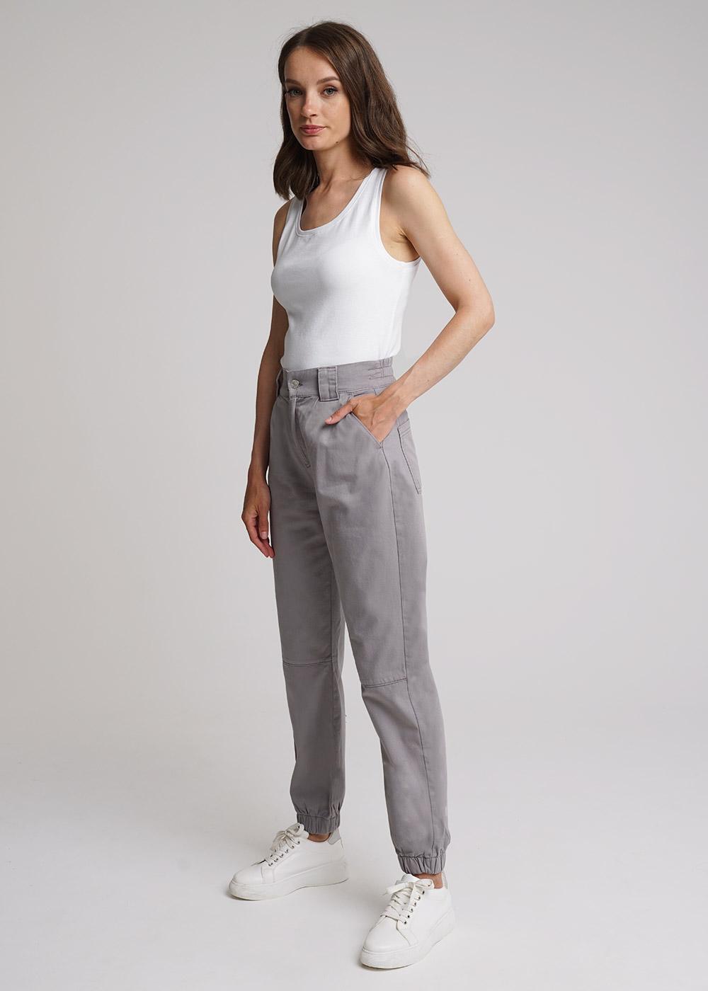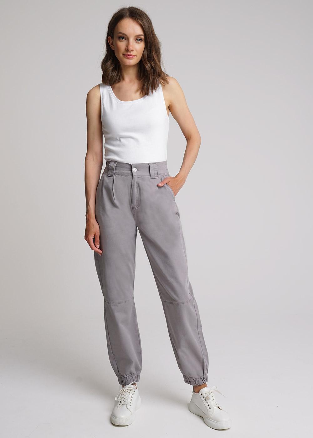 "Описание: Брюки умеренного объема, комфортной посадки из габардина. Функциональный гульфик. По бокам карманы. Низ брюк на резинке. На детали переда защипы. На колене рез.