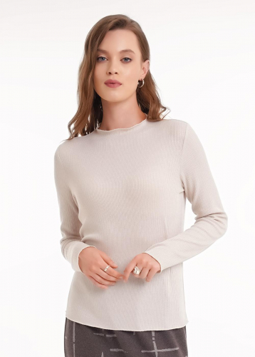 Описание: Вязаный джемпер умеренного обьема из акриловой пряжи с добавлением полиэстера, ластичного переплетения с контрастными горизонтальными узкими полосками. По горловине двойная бейка. По низу рукавов и изделия манжеты.