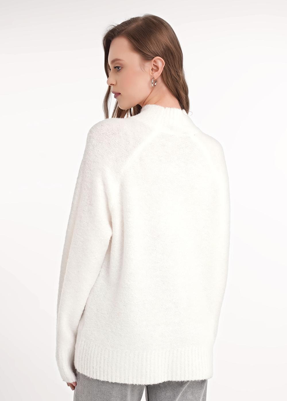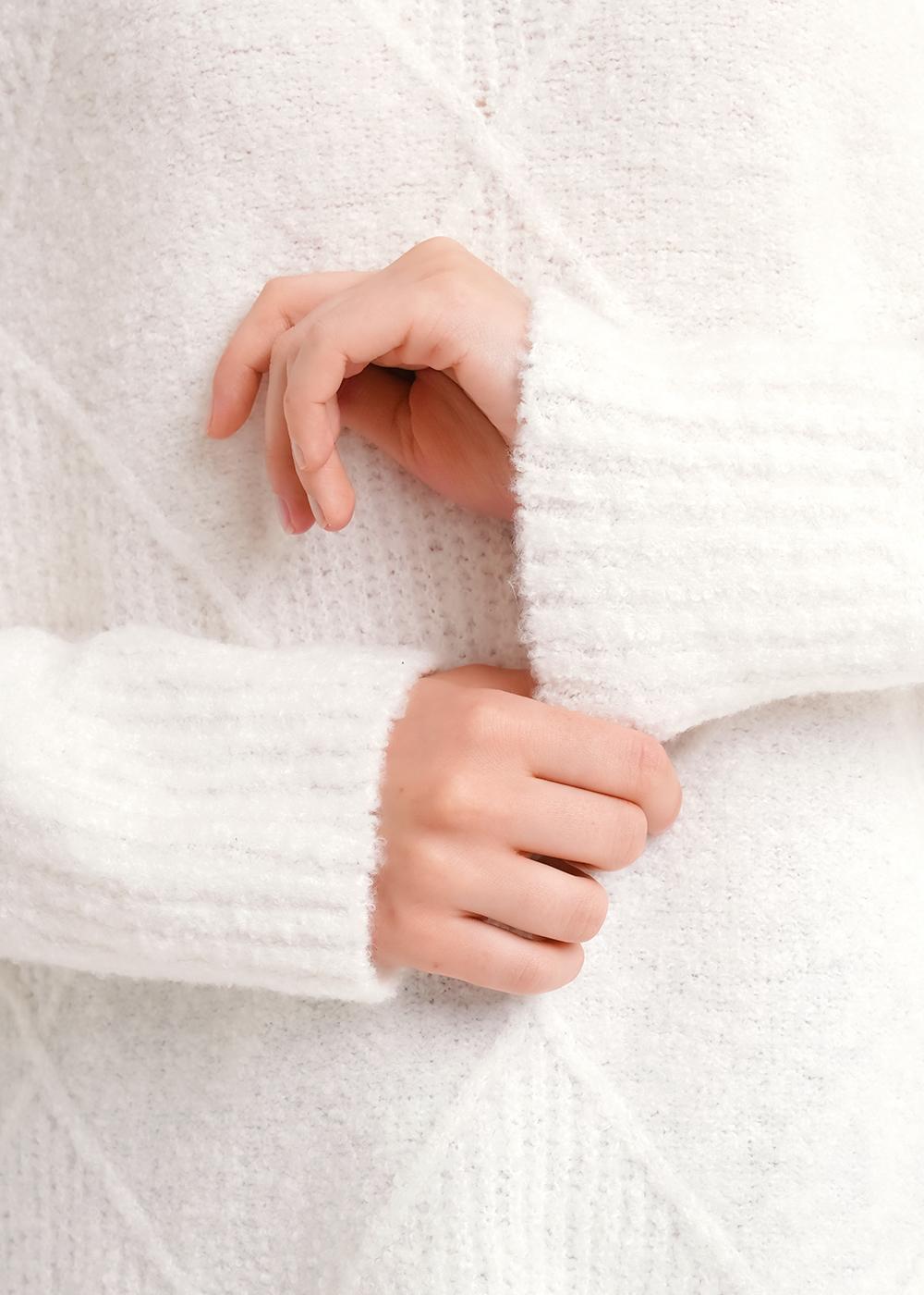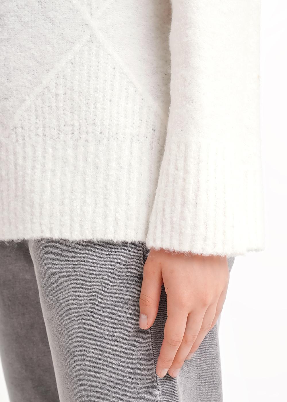 "Описание: Вязаный джемпер свободного силуэта из акриловой пряжи.Основное переплетение изнаночная гладь, спереди вывязанный рельефный рисунок в виде ромбов. Длинный рукав реглан. По низу рукава и изделия манжеты. Округлая горловина с полустойкой.