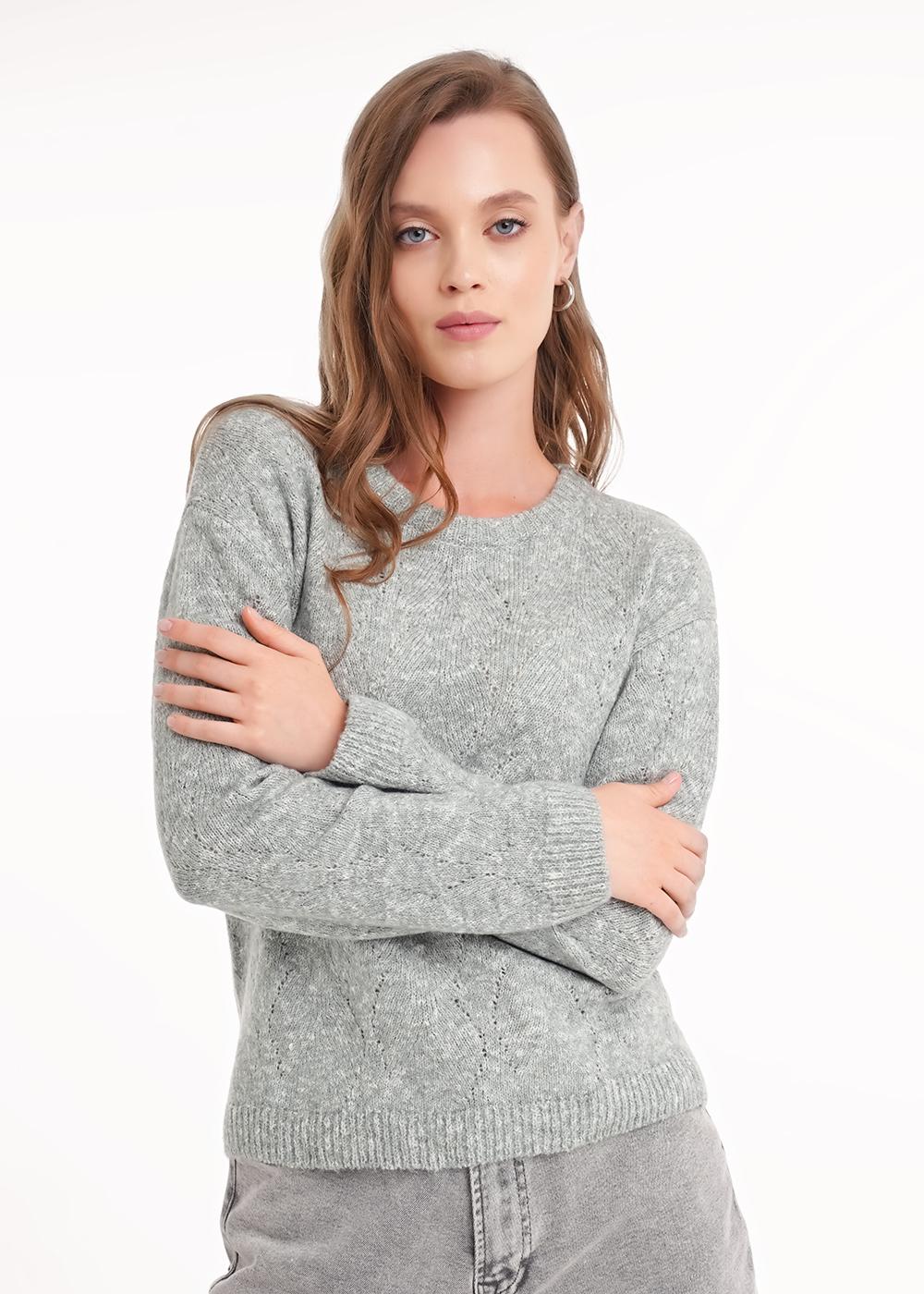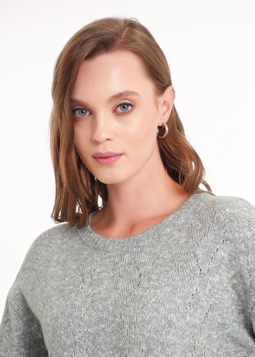 "Описание: Вязаный джемпер прямого силуэта из акриловой пряжи с добавлением хлопка, основное переплетение - гладь косы. Длинный втачной рукав. Округлая горловина с бейкой. По низу изделия и рукавов манжеты.