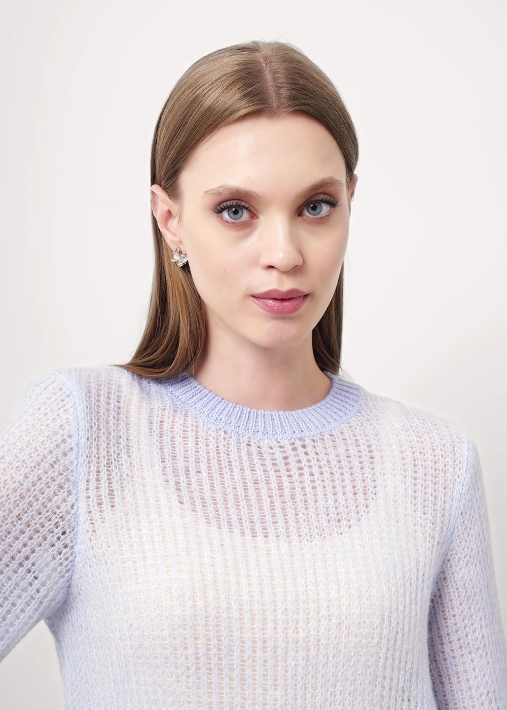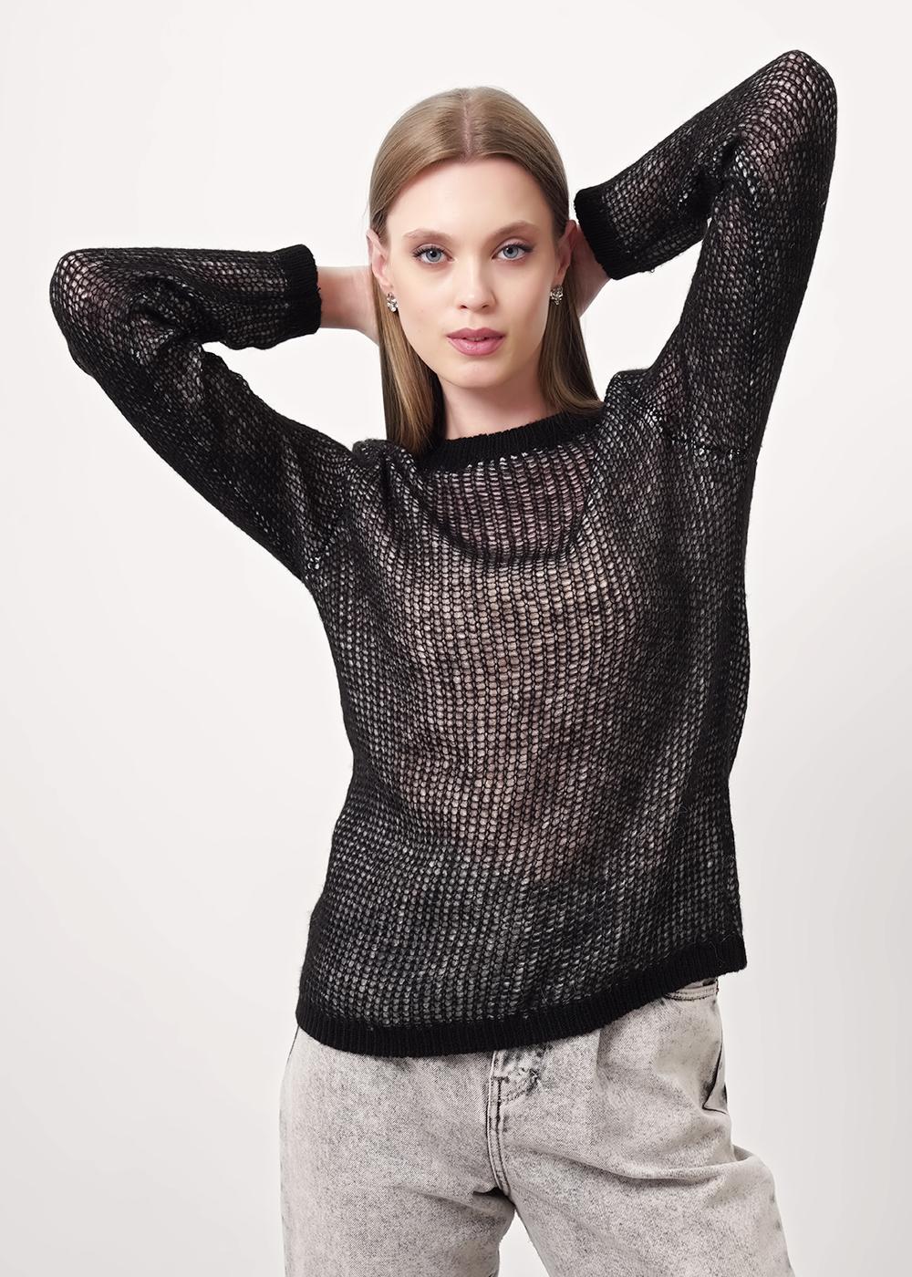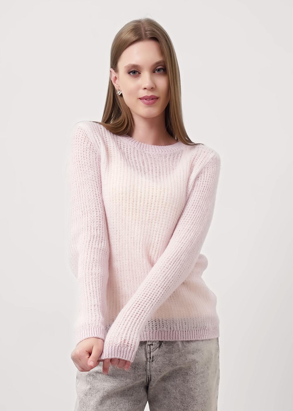 "Описание: Вязаный джемпер из акриловой пряжи, переплетения полуфанг. Длинный втачной рукав. Округлая горловина с бейкой. По горловине и манжетам ластик.