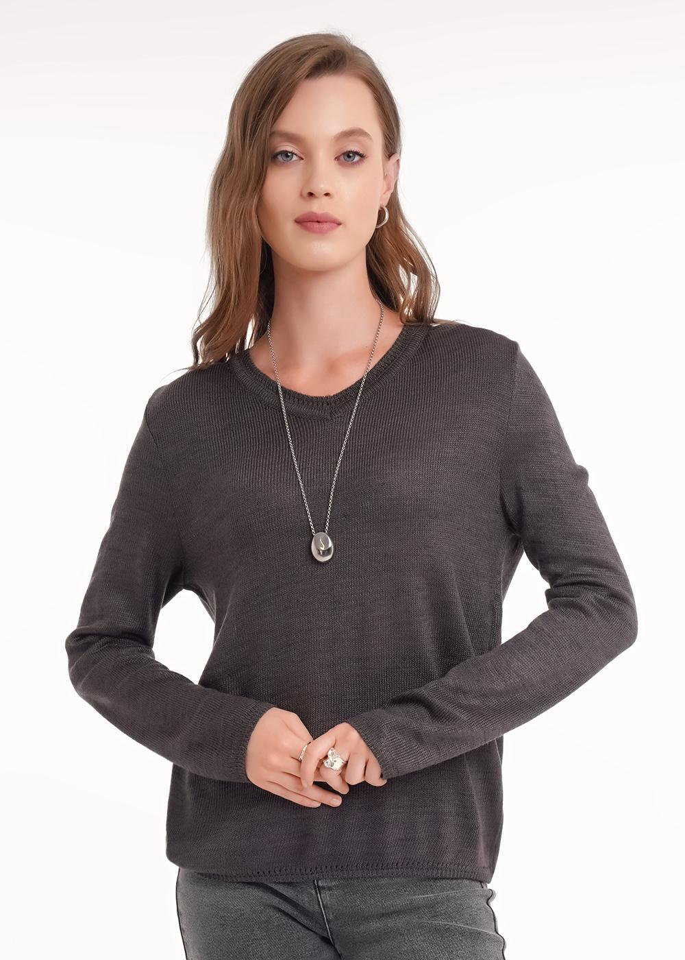 "Описание: Вязаный джемпер прямого силуэта из акриловой пряжи, переплетения гладь. Длинный втачной рукав. V-образный вырез горловины. По горловине,низу рукава и изделия ажурный рулик.