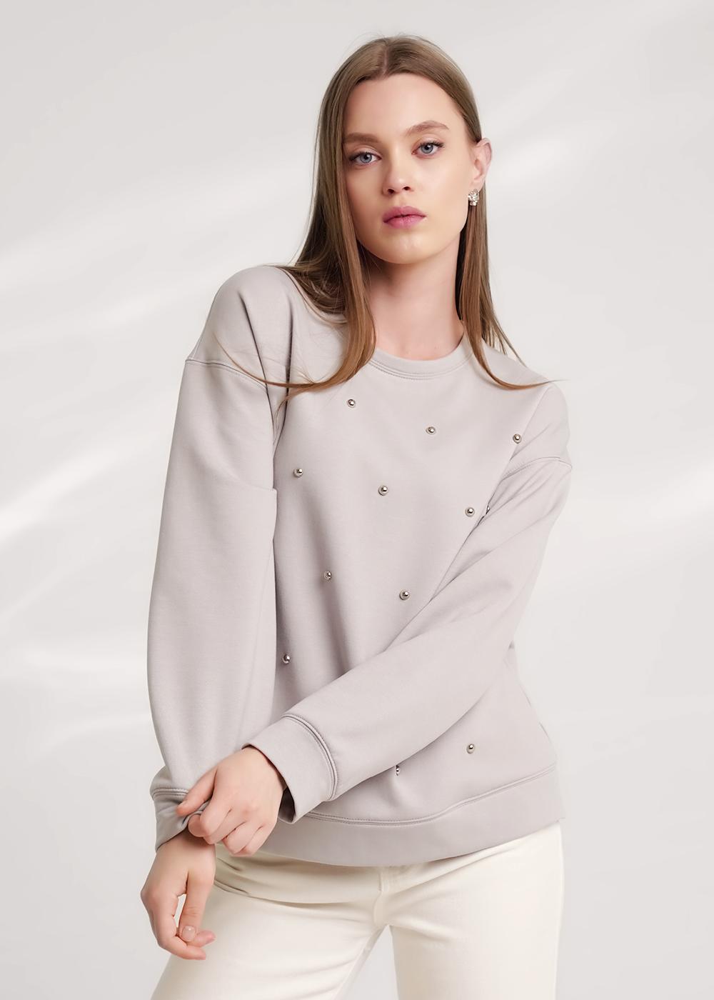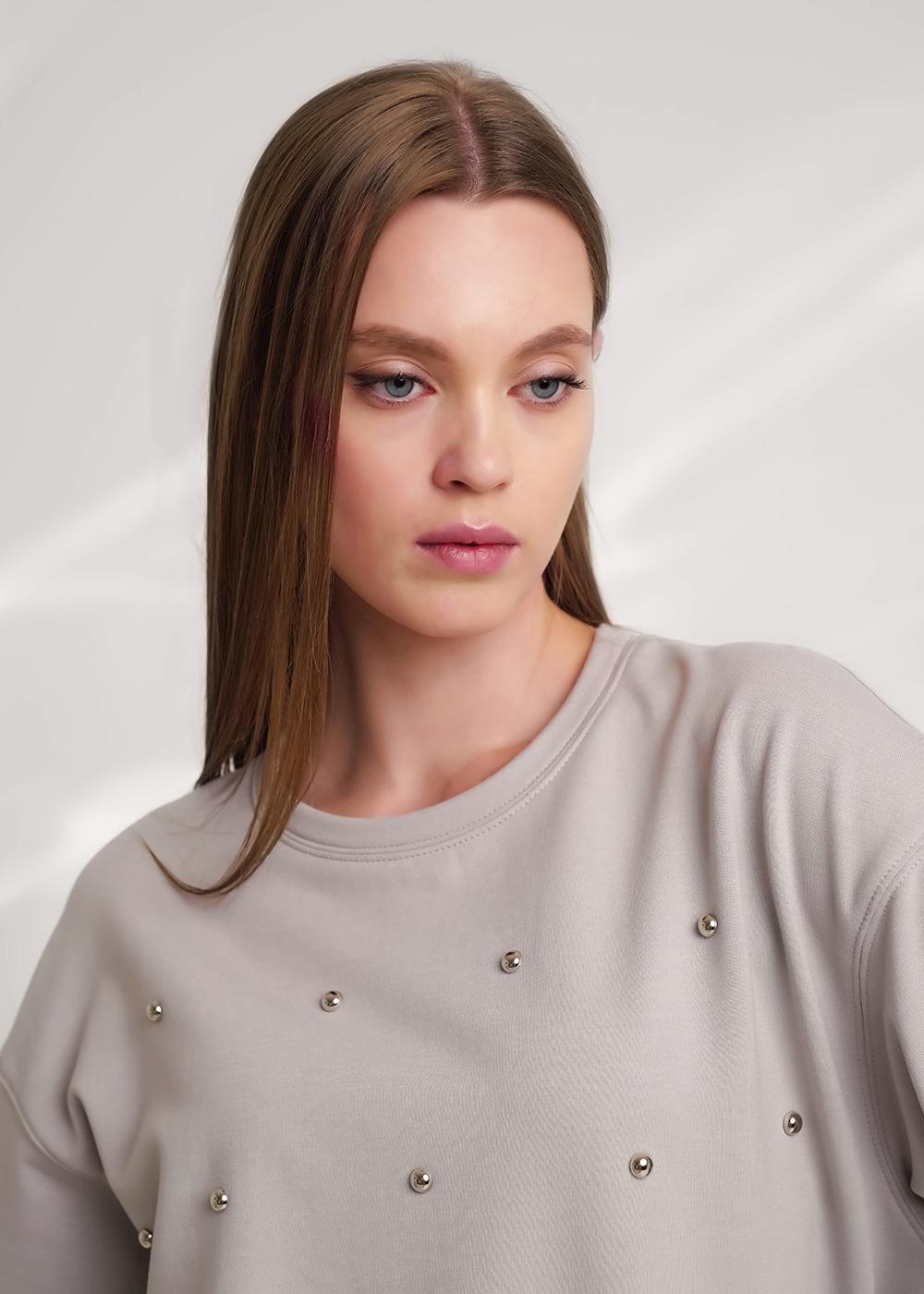 "Описание: Джемпер из трикотажного полотна футер с начесом, свободного силуэта. Округлая горловина с обтачкой. Длинный рукав со спущенной линией плеча. По низу рукава и изделия манжеты. Спереди пробивные бусины.
