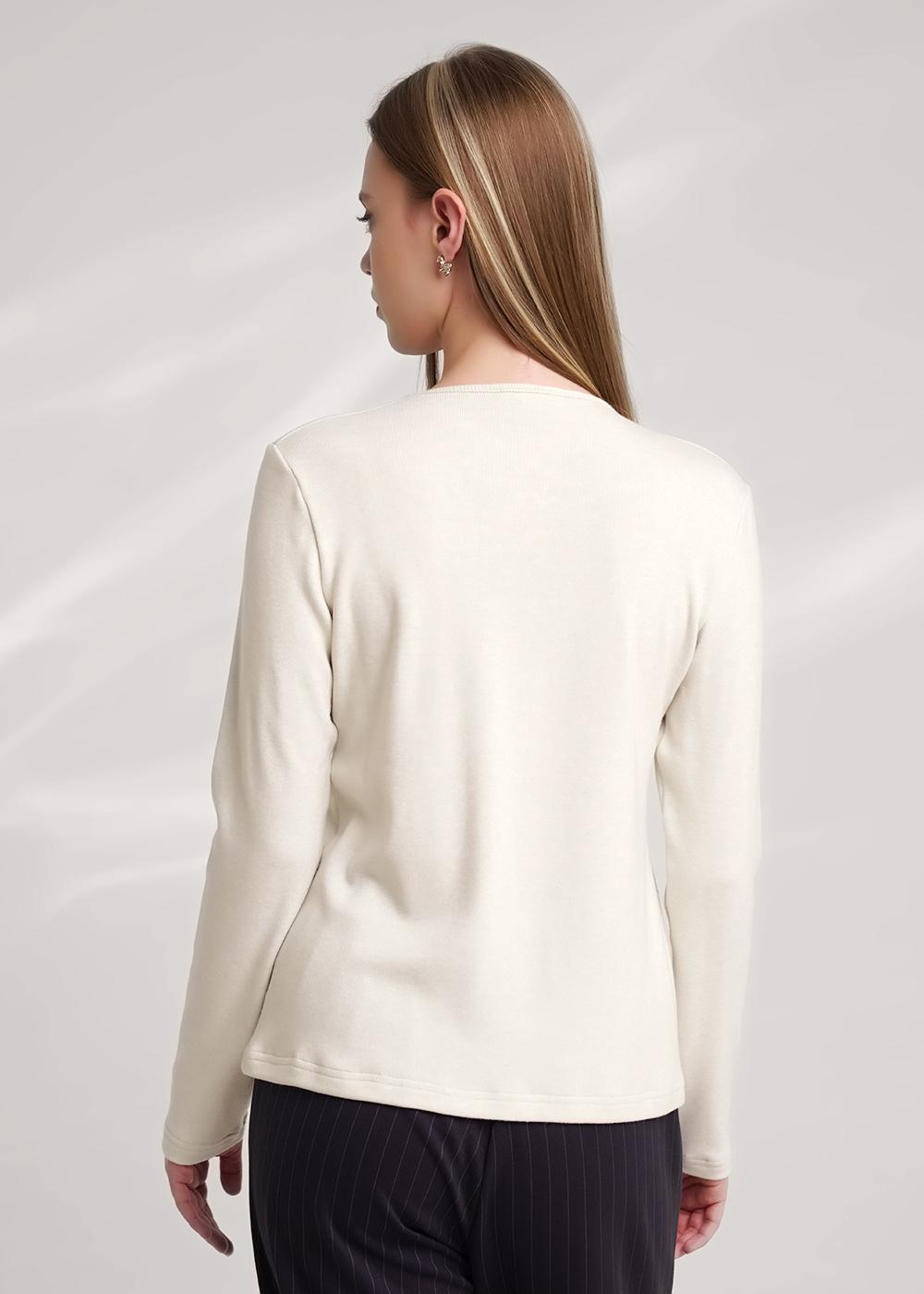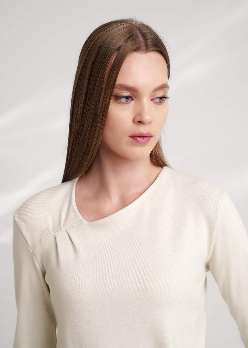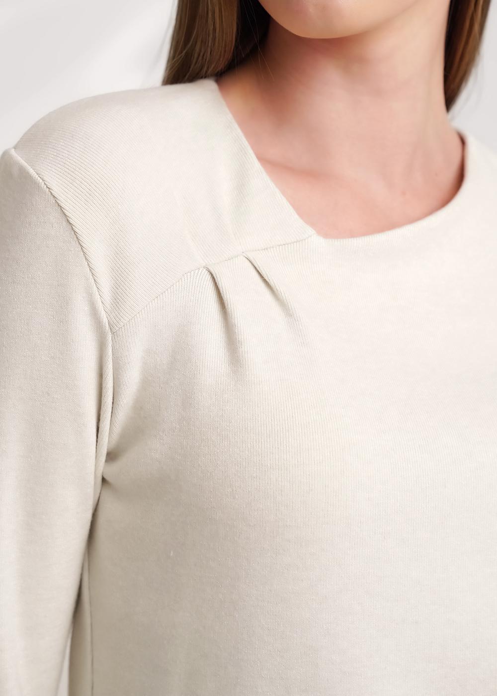 "Описание: Джемпер из трикотажного полотна вискоза вязанная, прямого силуэта. Длинный втачной рукав. Ассиметричный вырез горловины с внутренней обтачкой, переходящий в рез со складками. По горловине спинки внутренняя окантовка.