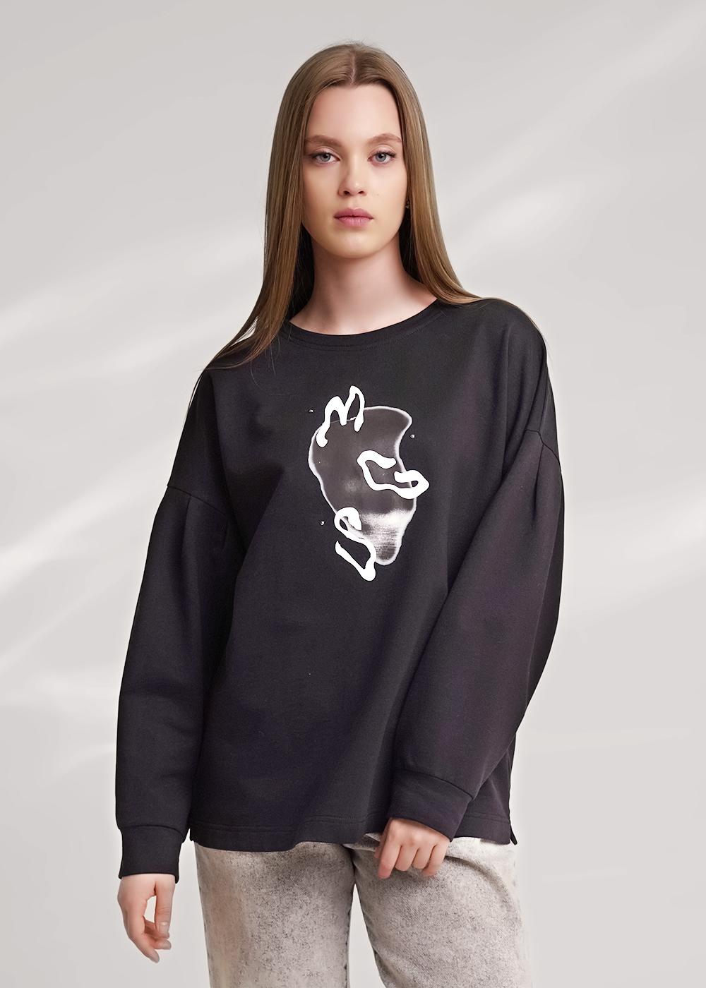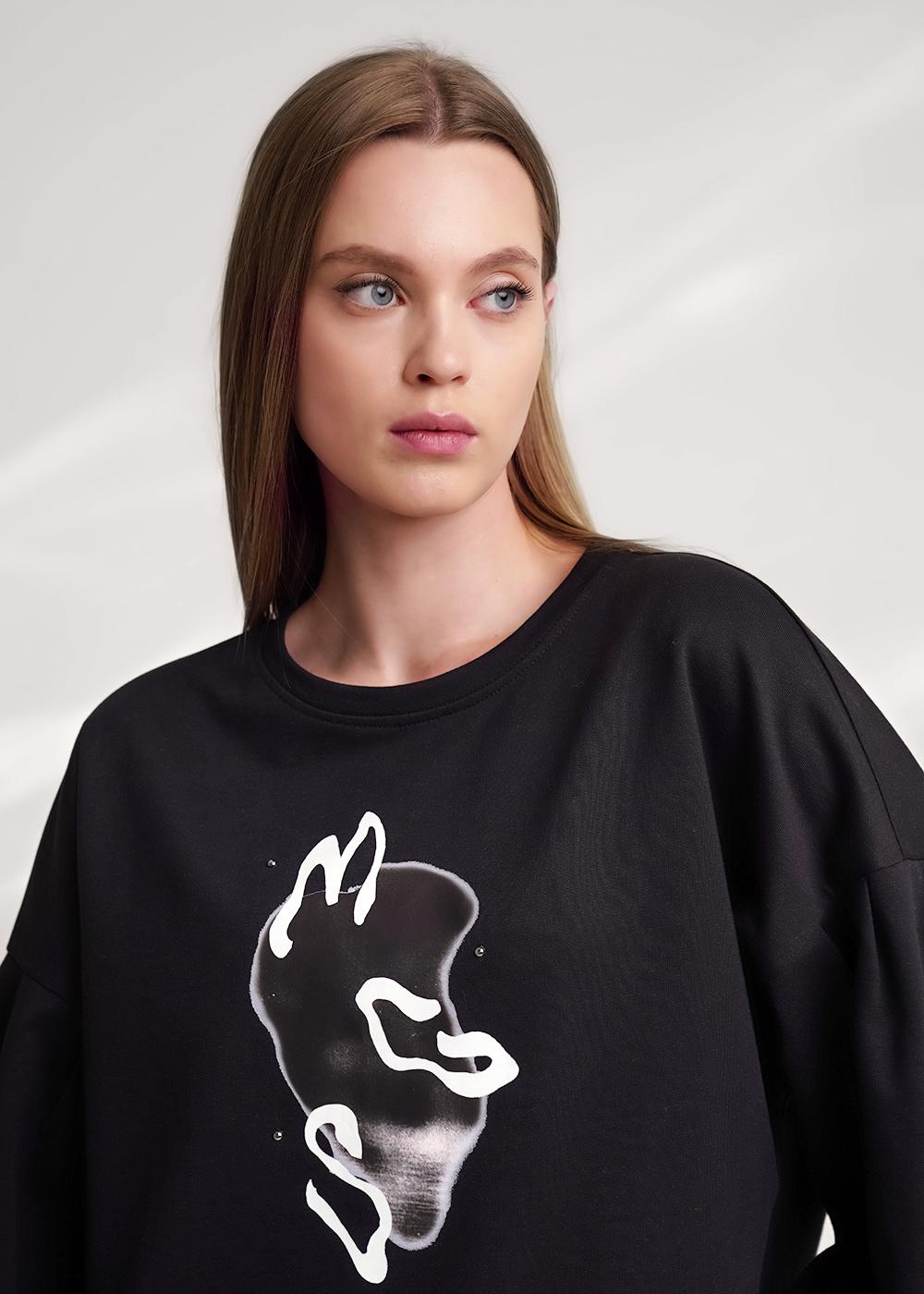 "Описание: Джемпер из хлопкового трикотажного полотна футер,свободного кроя.Округлая горловина с обтачкой. Длинный рукав со спущенной линией плеча, внизу на манжете.По окату рукава складки.По низу изделия широкая подгибка с боковыми разрезами.Спереди термонаклейка.