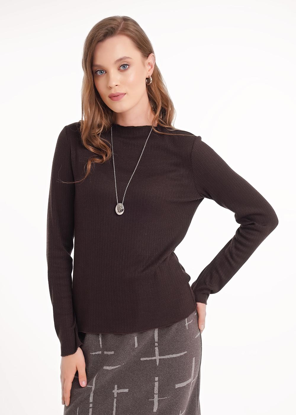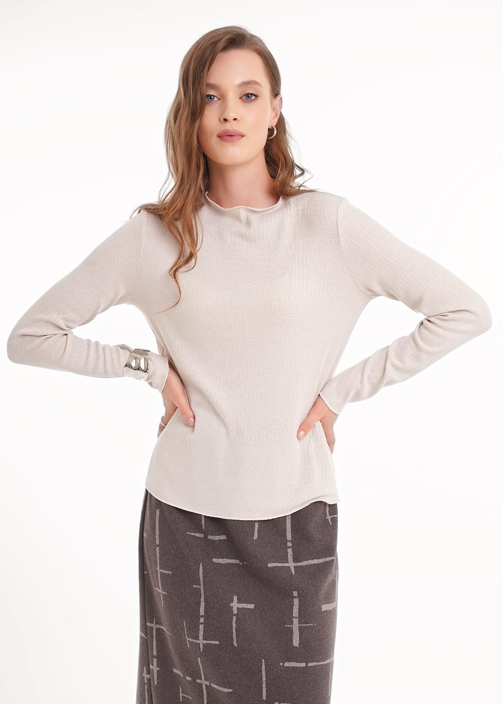"Описание: Джемпер из трикотажного поливискозного полотна кашкорсе с эластаном. Прямого силуэта. Длинный втачной рукав. По горловине цельвыкроенная стойка. По горловине, низу рукава и изделия обработка мелкий оверлок.