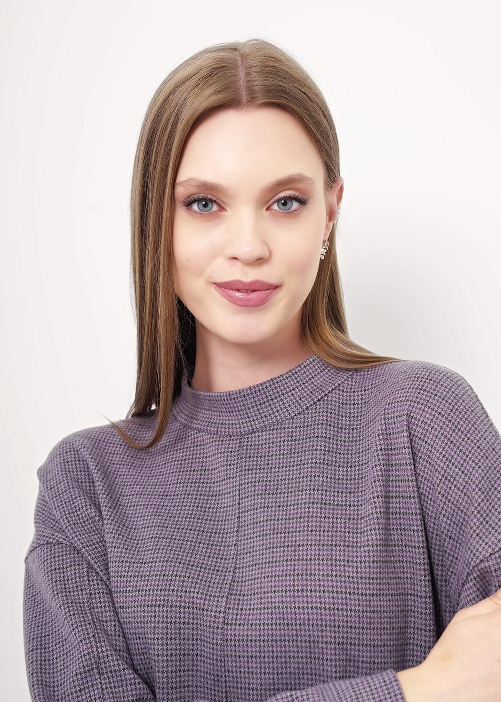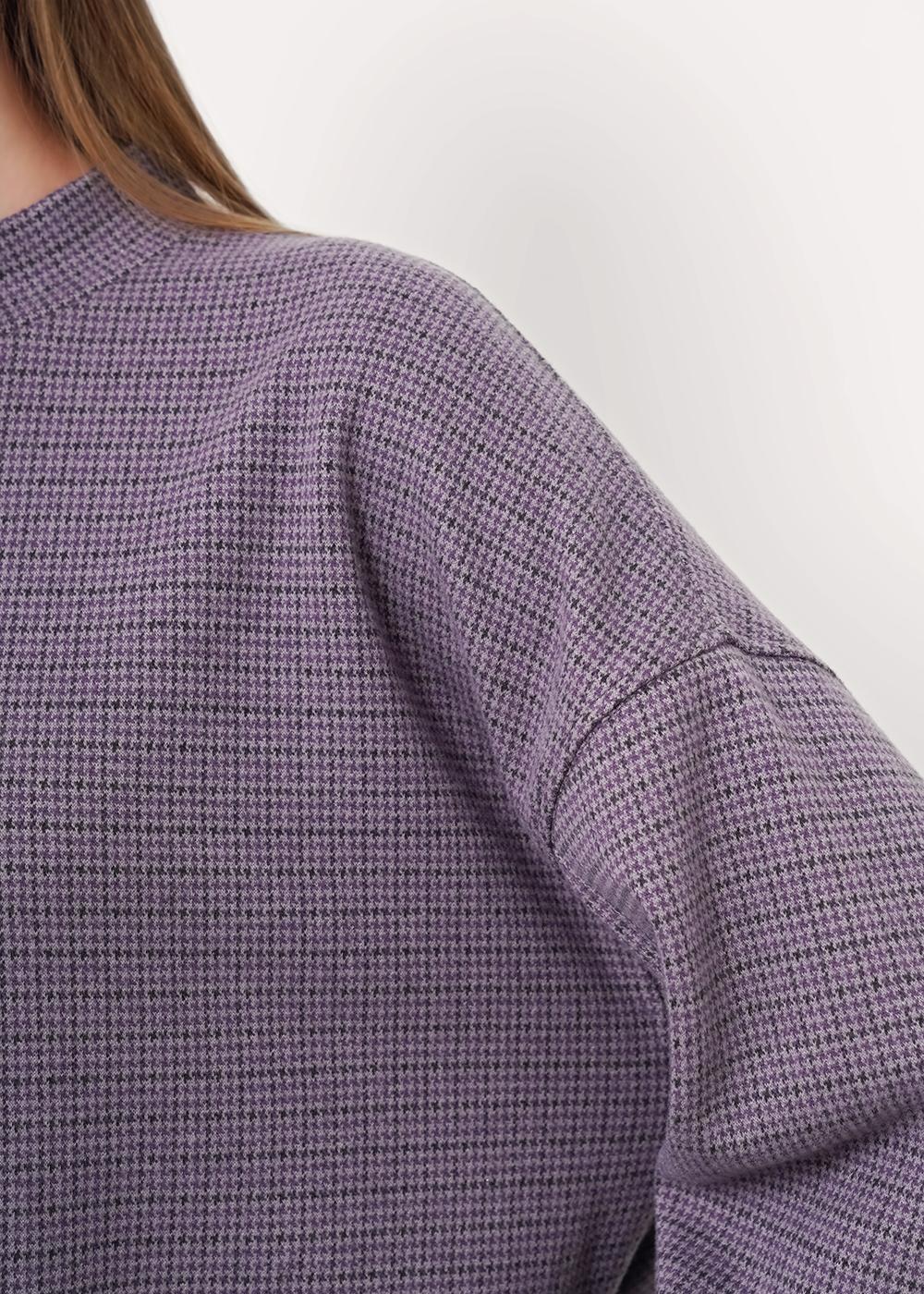"Описание: Джемпер объёмный из поливискозного трикотажного полотна джерси. Спущенный длинный рукав. По горловине стойка с молнией по спинке. По переду и спинке средний шов. По низу изделия потайной стежок. Спереди нашивка металл.