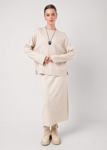 Описание: Джемпер объёмный из трикотажного полотна с люрексом. Горловина лодочка с окантовкой. Рукав спущенный, длиной ниже логтя. По переду рельефы внизу с разрезами.