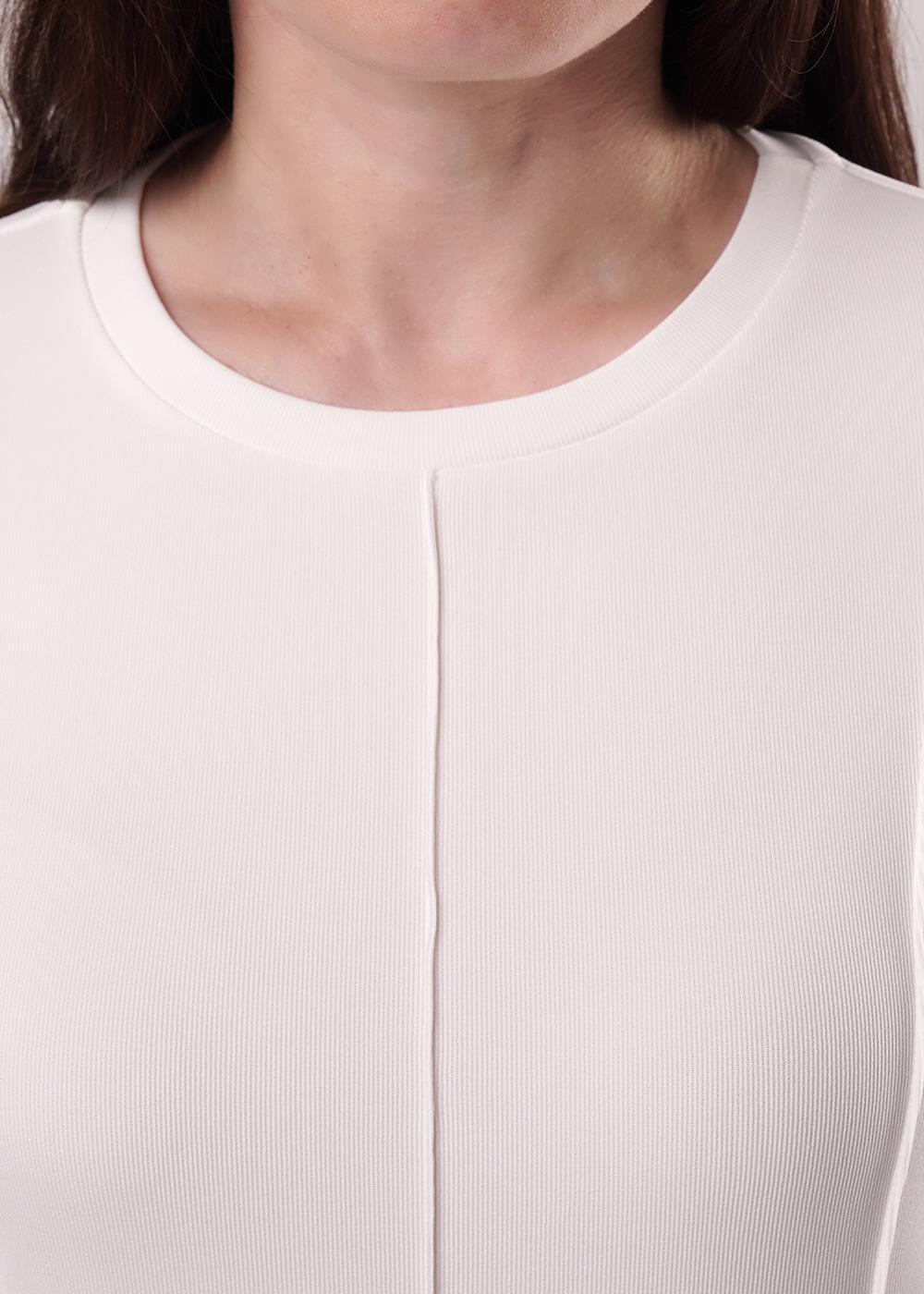 "Описание: Фуфайка прямого силуэта из трикотажного полотна из полиэстера и эластана. Втачной длинный рукав. Округлая горловина с обтачкой. По переду и спинке декоративные защипы.