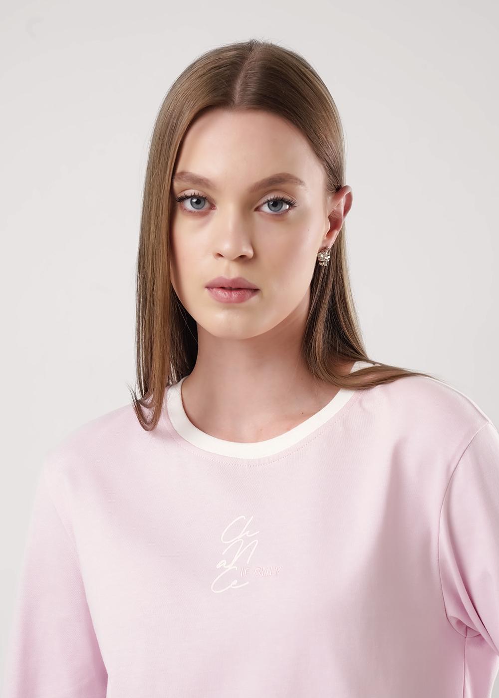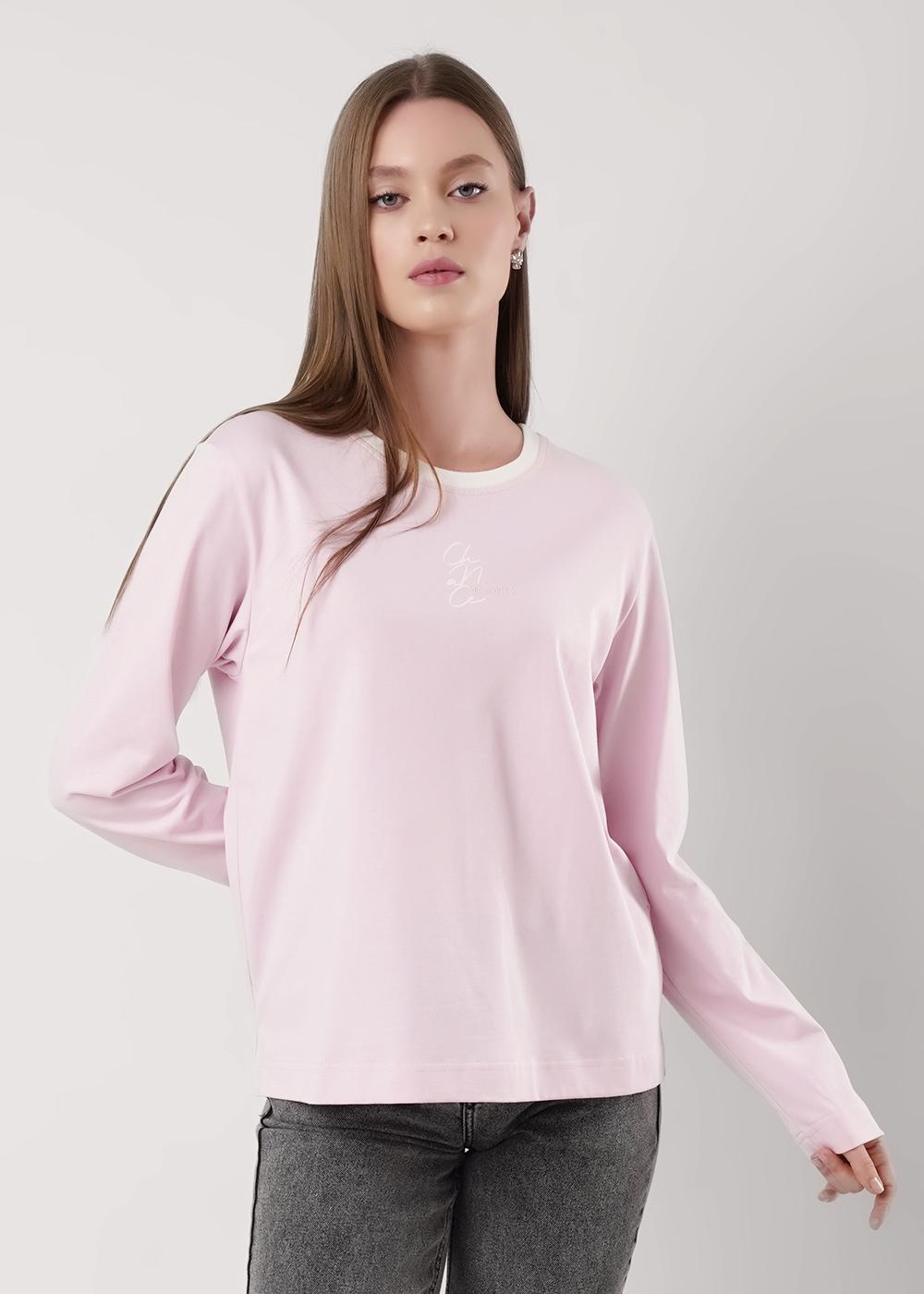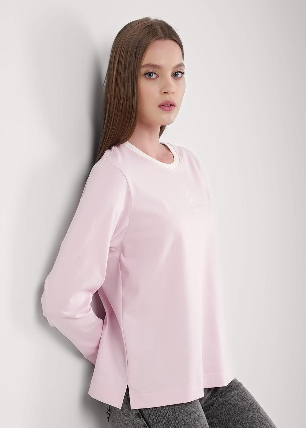 "Описание: Фуфайка прямого силуэта из хлопкового трикотажного полотна. Втачной длинный рукав. Округлая горловина с контрастной обтачкой. По бокам разрезы. Спереди принт с вышивкой.
