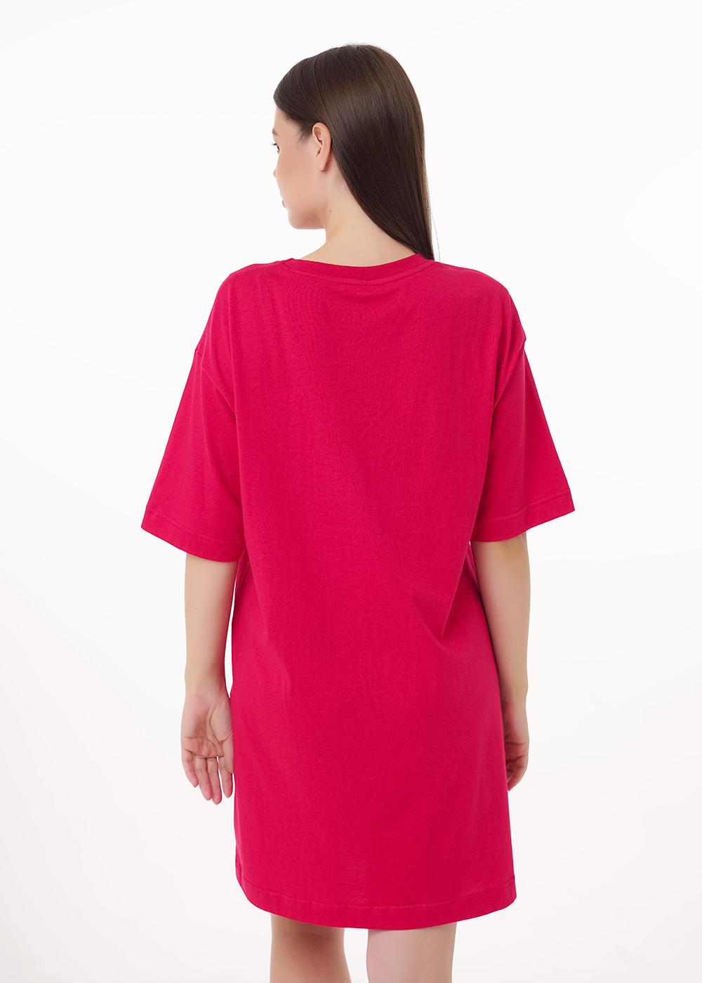 Описание: Платье для дома и отдыха из хлопкового трикотажного полотна прямого кроя. Округлая горловина с обтачкой. Короткий втачной рукав. По переду рез с разрезом .Спереди принт.