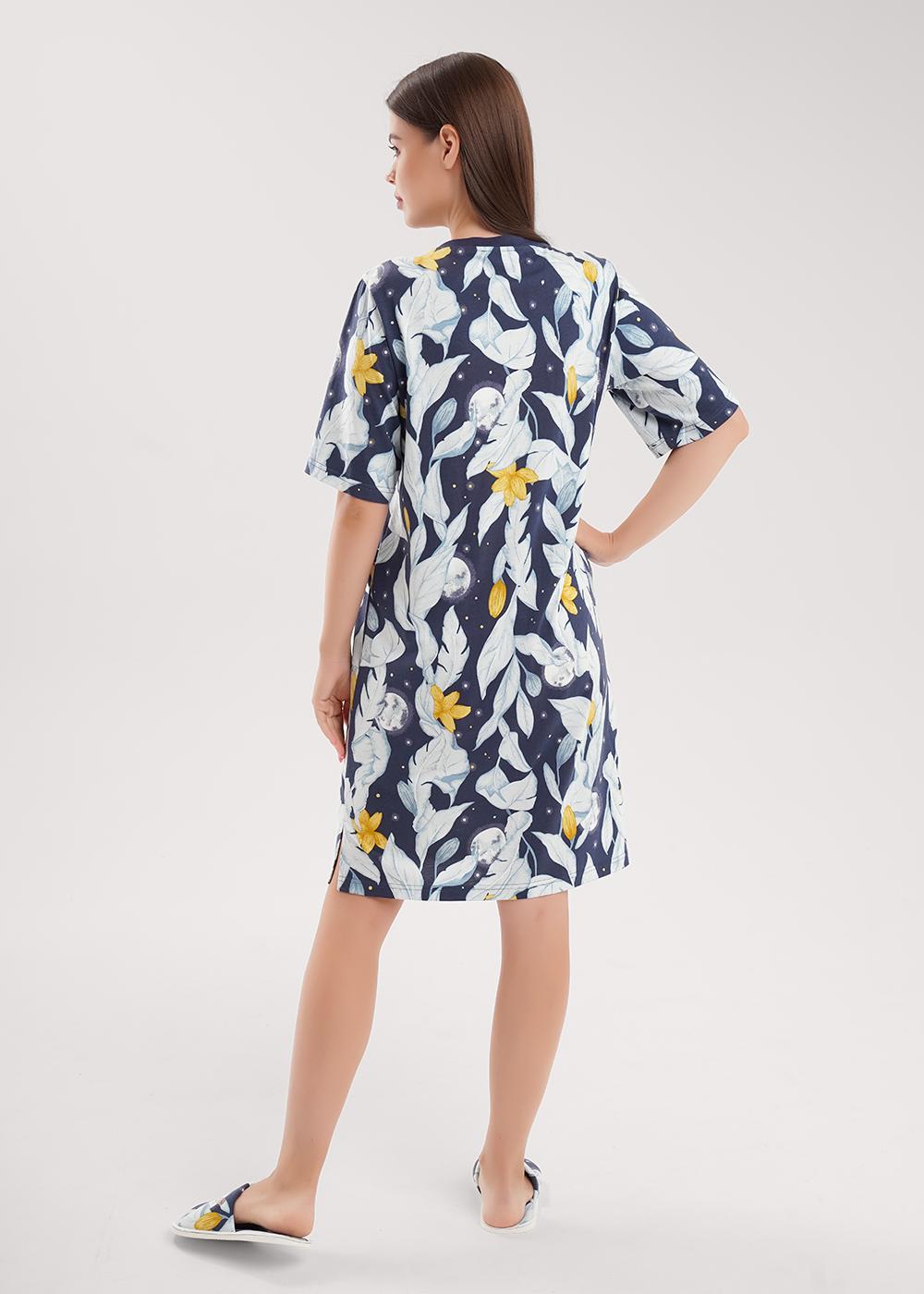 Описание: Платье прямого силуэта из хлопкового трикотажного полотна с добавлением модала. Короткий втачной рукав. Округлая горловина с обтачкой. Спереди накладные карманы с кантом. По бокам разрезы.