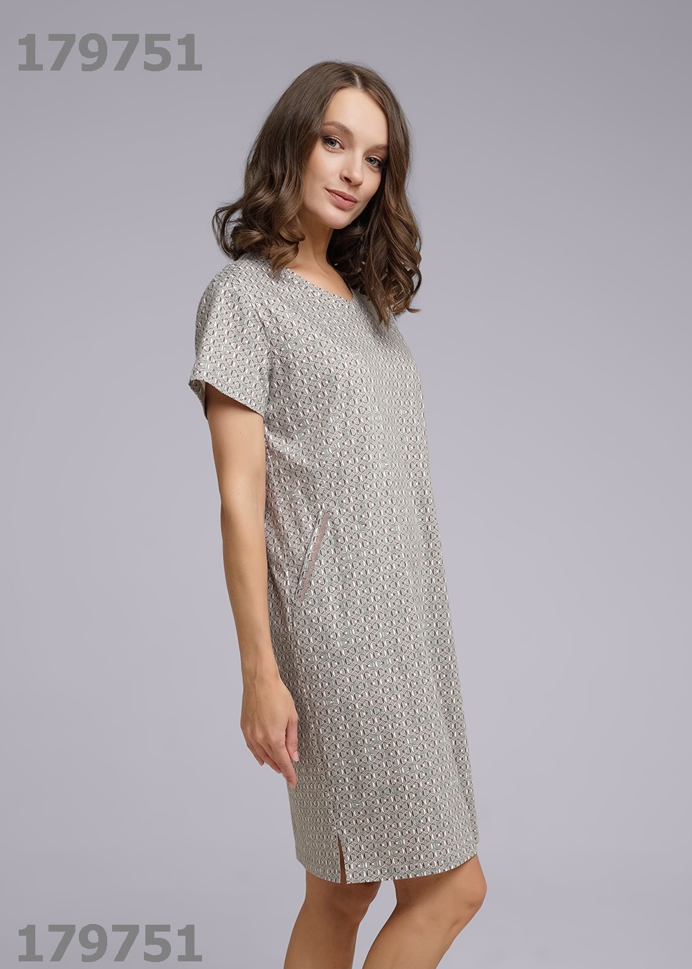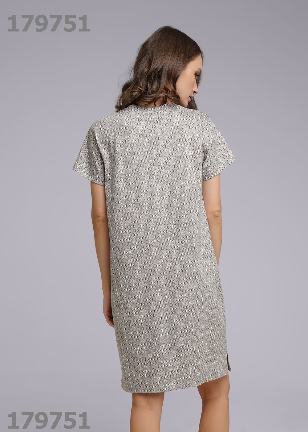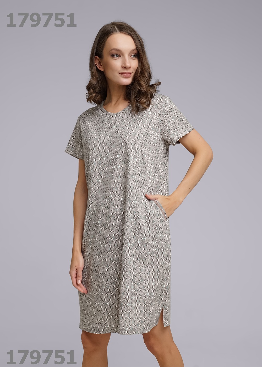 Описание: Платье для дома из хлопкового трикотажного полотна. Короткий втачной рукав. V-образный вырез горловины. На детали переда вытачки из бокового шва с карманами в листочку. Карманы декорированы узким кружевом. По бокам разрезы.