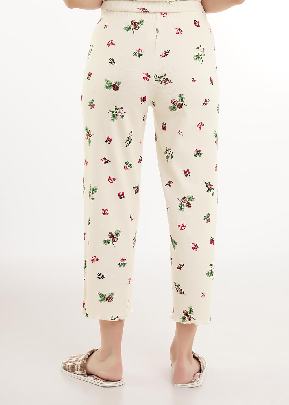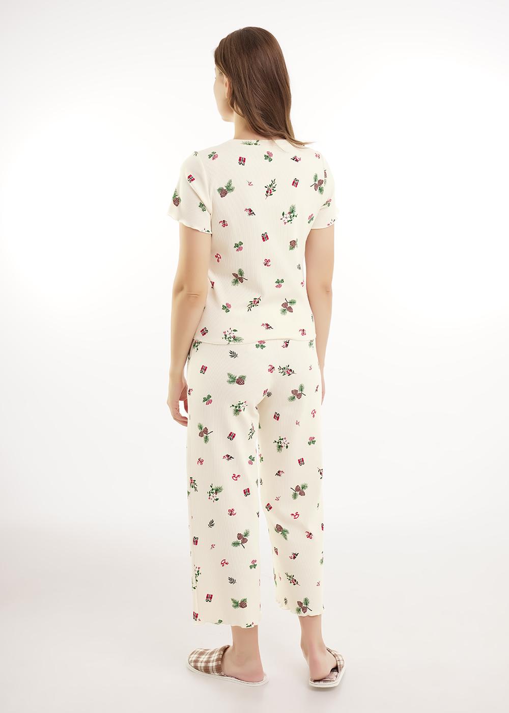 Описание: Пижама из трикотажного полотна кашкорсе с эластаном. Футболка прямого кроя, короткий втачной рукав, округлая горловина с обтачкой. Брюки прямые, пояс на внутренней резинке, нашивка бант. По низу футболки, рукавов и брюк мелкий оверлок.