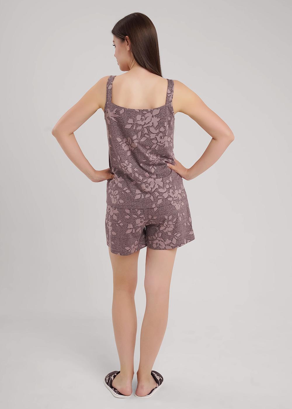 Описание: Пижама для дома из трикотажного полотна с добавлением модала. Майка умеренного объема на бретеля. По горловине переда обтачка с кантом, бант. По пройме окантовка. Короткие шорты свободного кроя, цельнокроеный пояс на внутренней резинке.