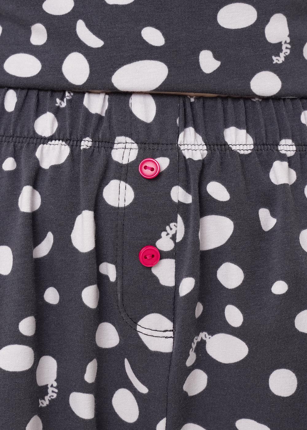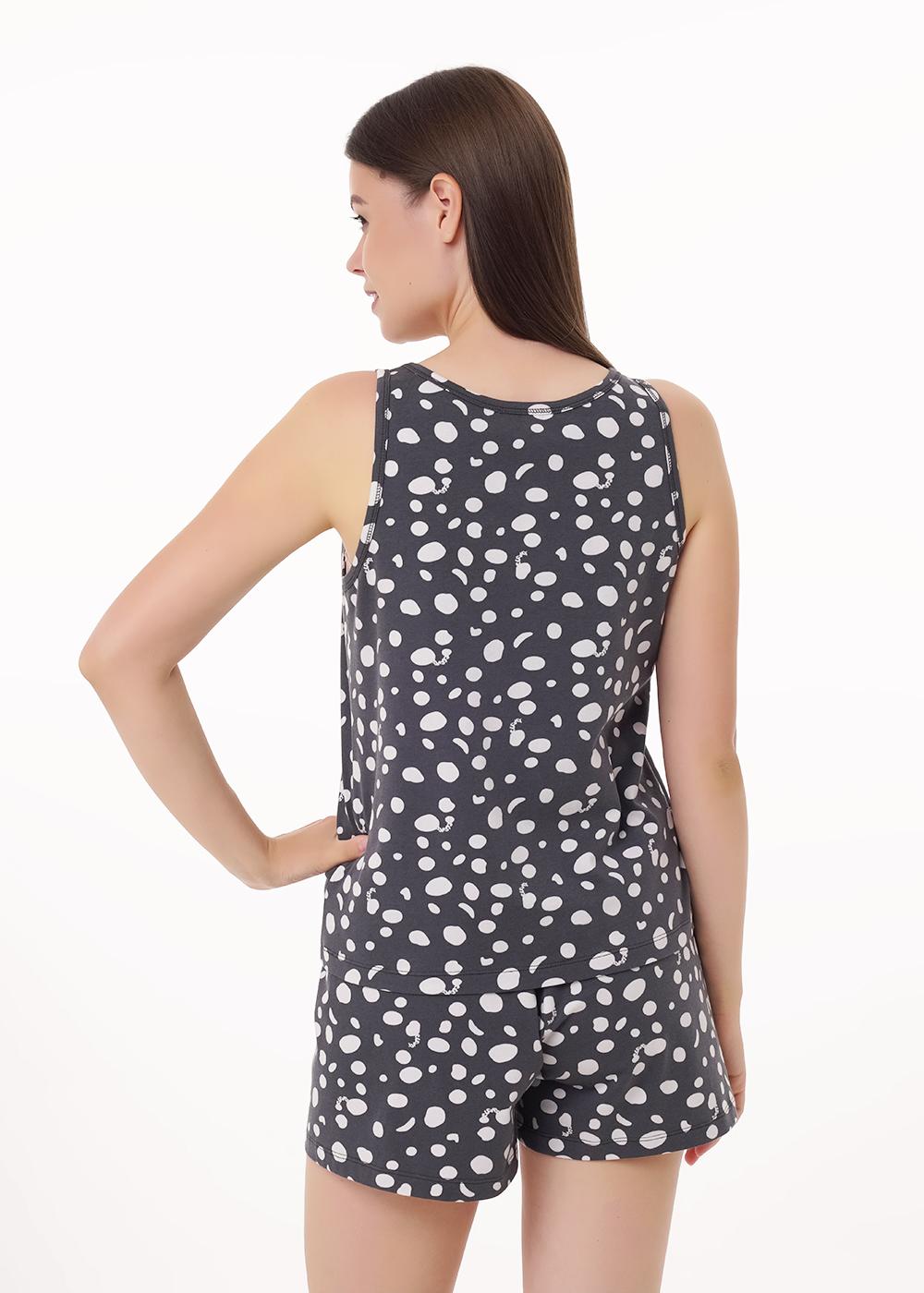 Описание: Пижама для дома из хлопкового трикотажного полотна с эластаном.Майка прямого силуэта, среднее плечо.По горловине и пройме окантовка с застилом, внизу нашивка.Короткие шорты с притачным поясом на внутренней резинке,спереди имитация гульфика с пуговицами.