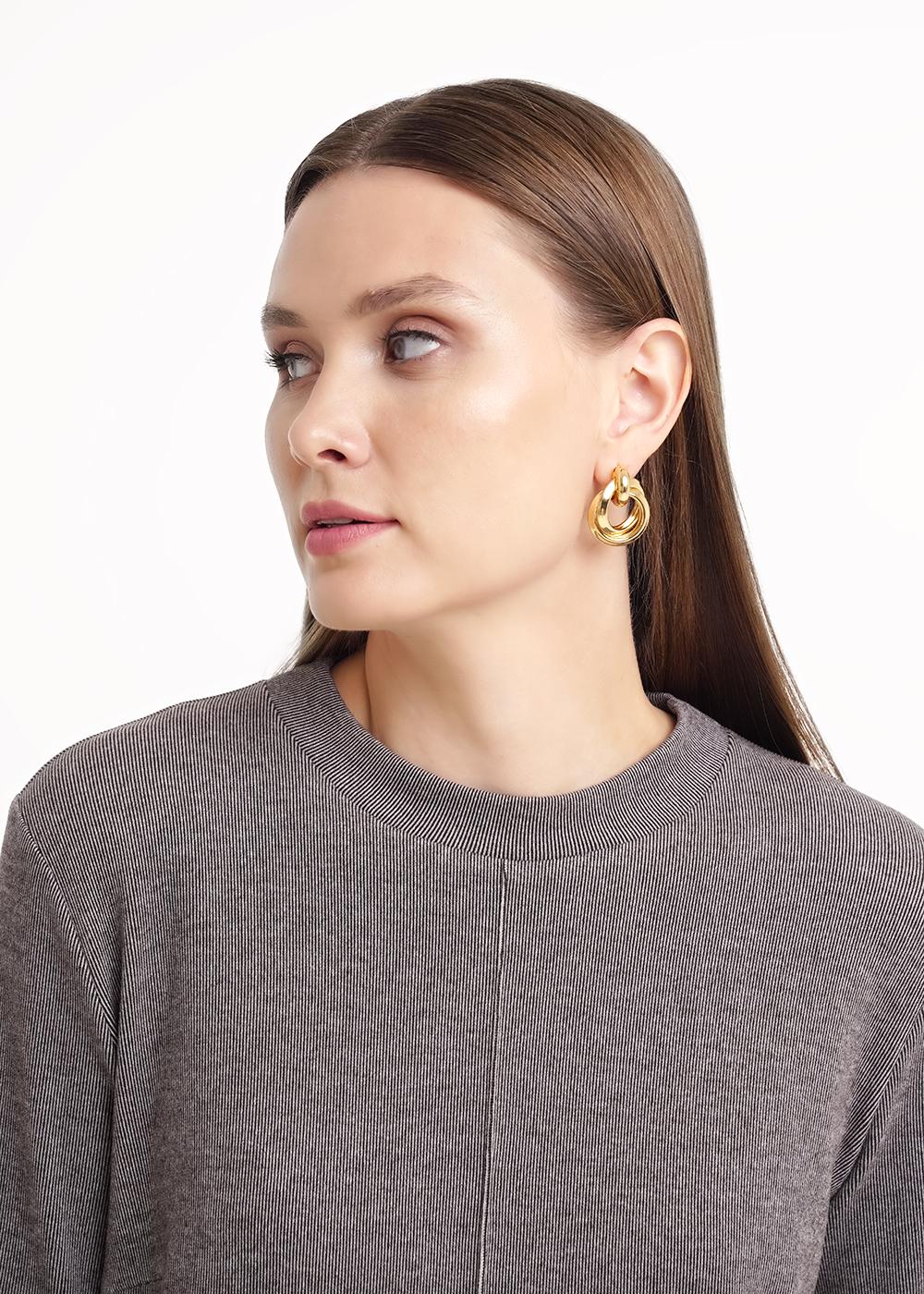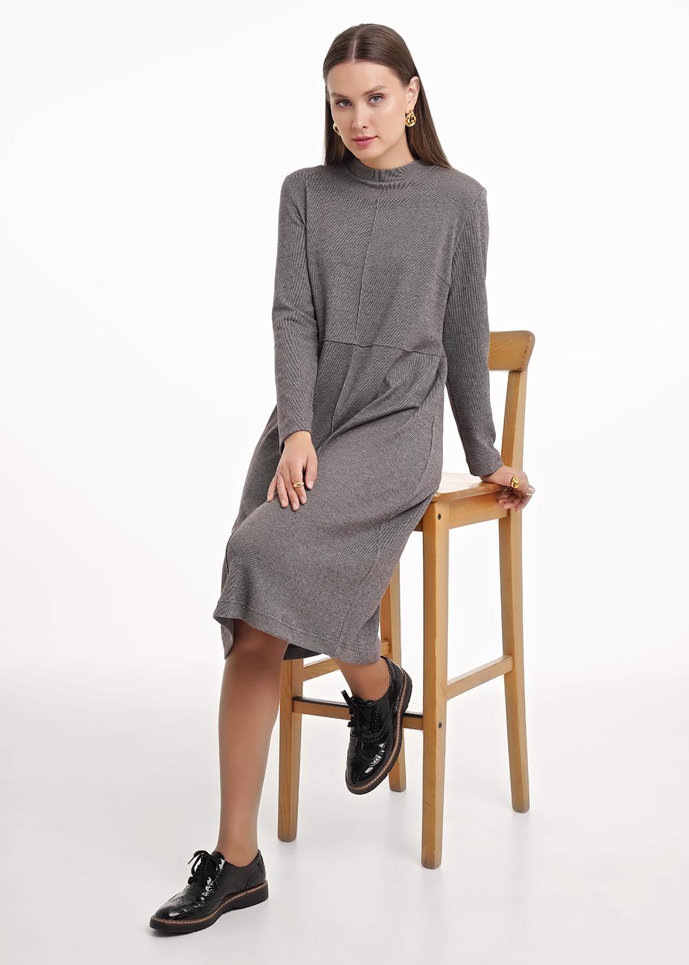 "Описание: Платье прямого силуэта из трикотажного полотна рибана с вискозой. Длиной ниже колена. Округлая горловина с обтачкой. По переду и спинке вертикальные и горизонтальные защипы. Длинный втачной рукав.