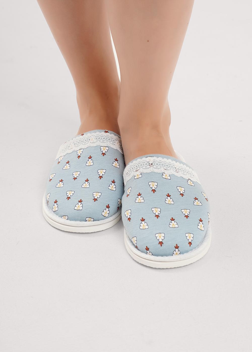 Описание: Лёгкие тапки для дома и отдыха с закрытым носом из хлопкового трикотажного полотна с добавлением модала, сверху узкое кружево. Толстая подошва.