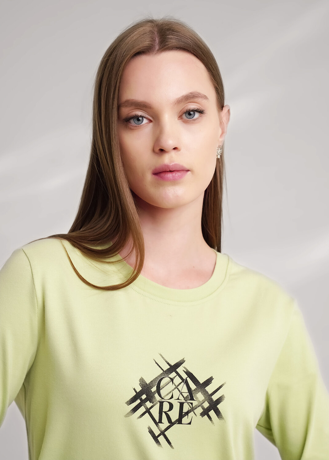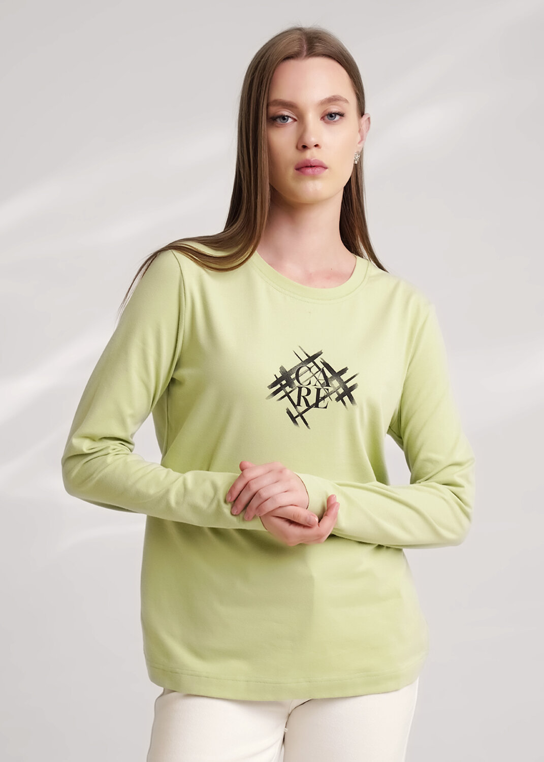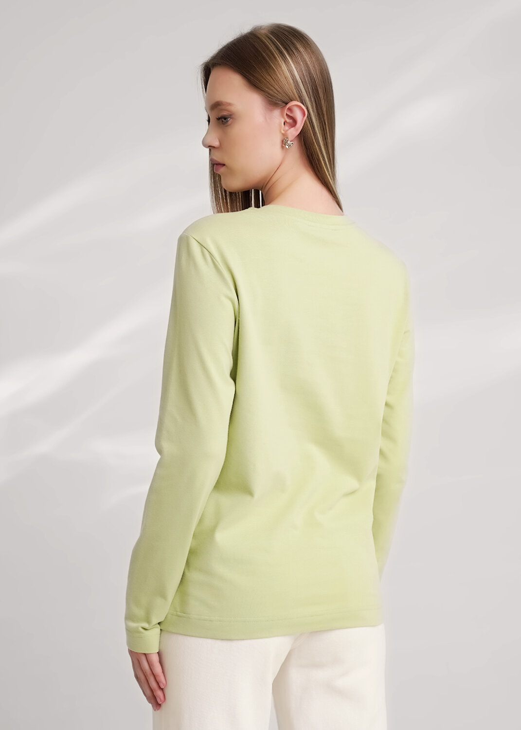 Фуфайка прямого силуэта из хлопкового трикотажного полотна с эластаном. Длинный втачной рукав. Округлая горловина с обтачкой. На детали переда принт.