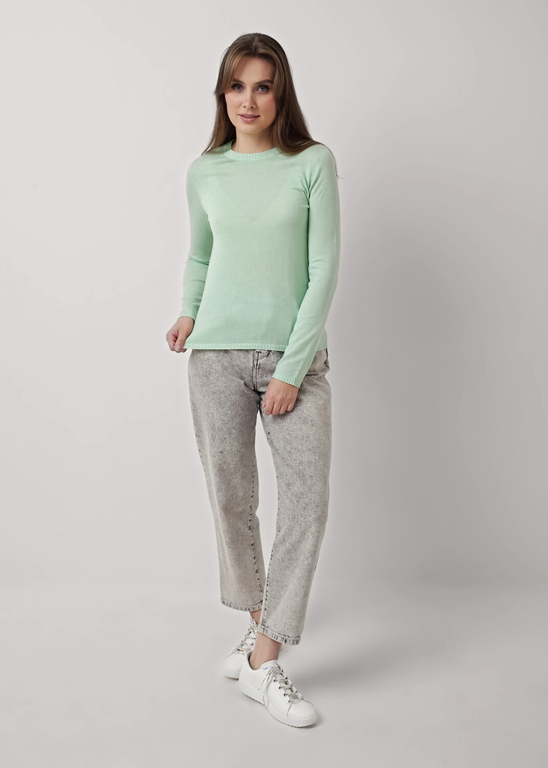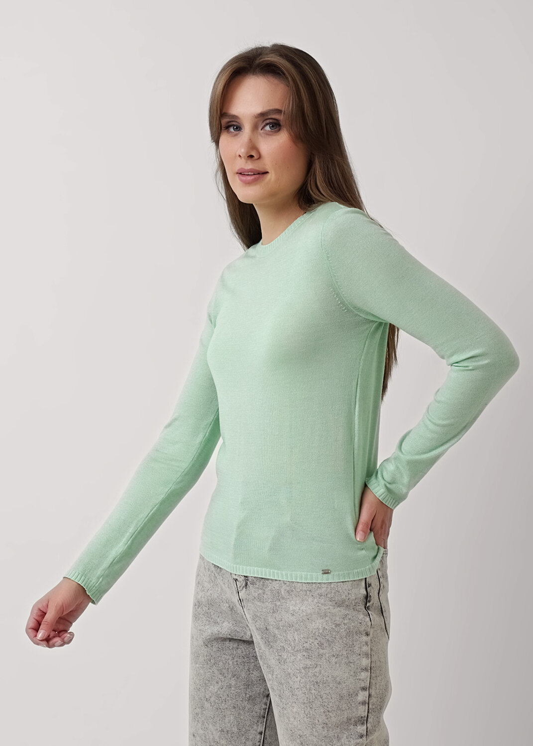 Вязаный джемпер прямого силуэта из вискозной пряжи с добавлением нейлона. Длинный втачной рукав. Основное переплетение гладь. Округлая горловина с бейкой. По низу изделия и рукавов узкие манжеты, нашивка металл.