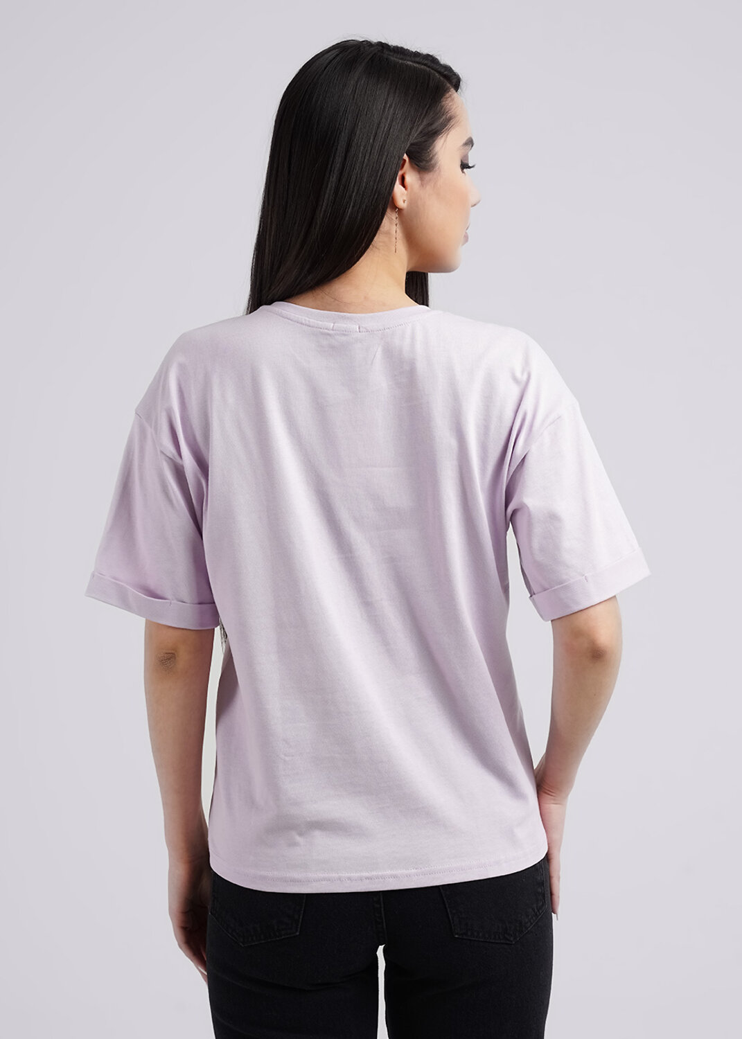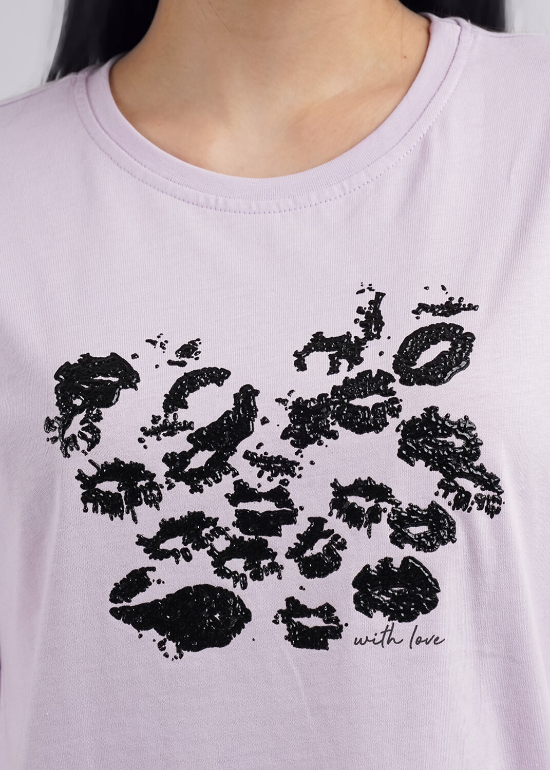 Джемпер из хлопкового трикотажного полотна. Короткий спущенный рукав с загибом. Круглый вырез горловины обработан рибаной. По переду принт.