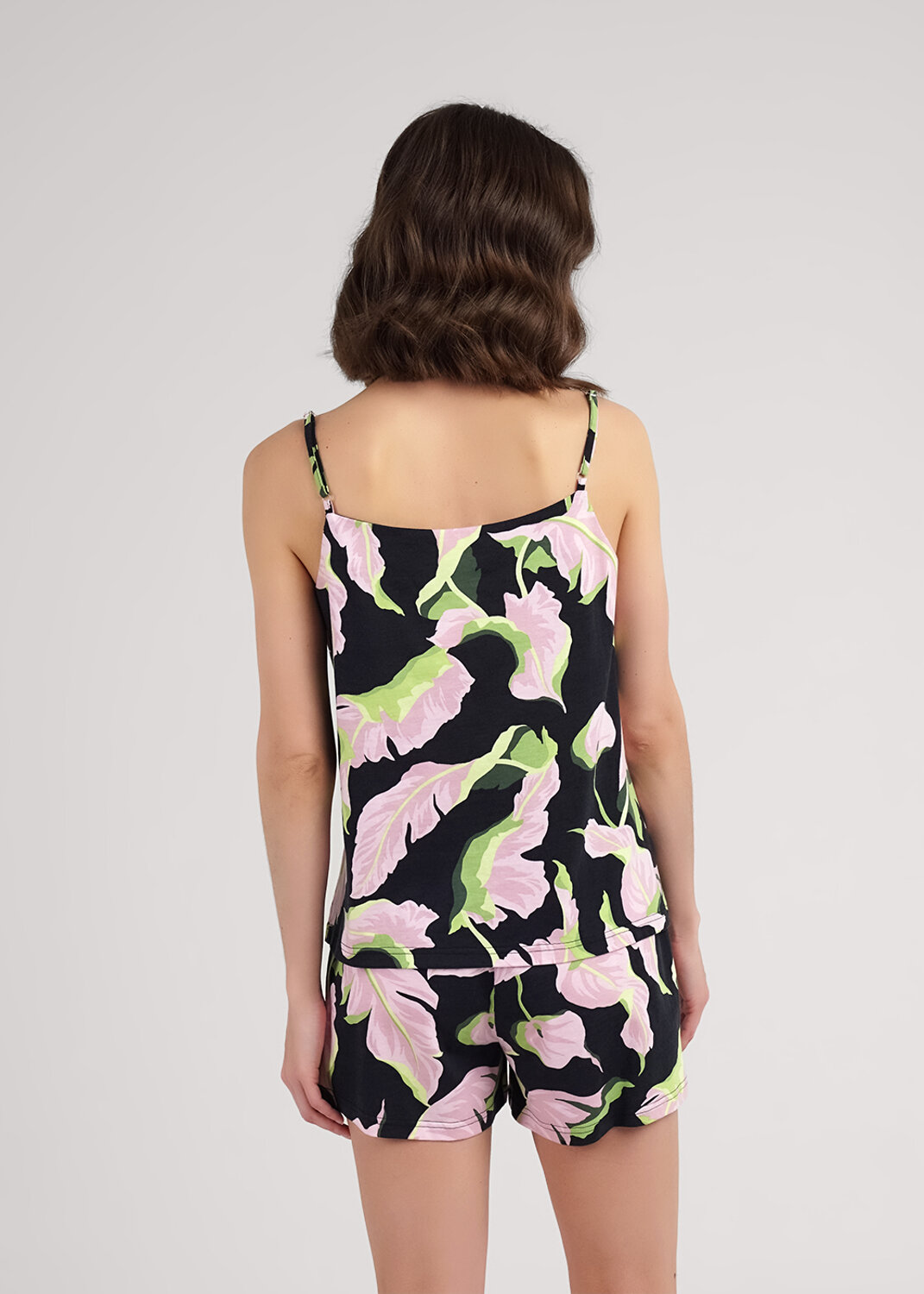 Пижама для дома и отдыха из хлопкового трикотажного полотна с добавлением модала. Майка с V-образным вырезом горловины. Узкая бретель с регулировкой длины. Горловина с внутренней обтачкой. Шорты с поясом на внутренней резинке.